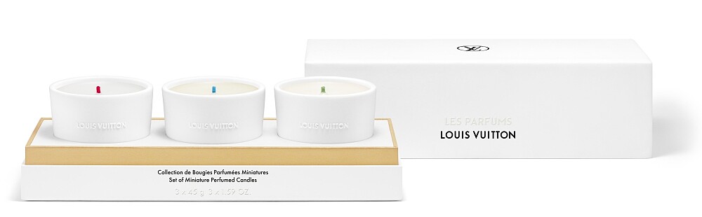 LV路易威登首次堆出三顆45g迷你香氛蠟燭的組合,包含L'Air du Jardin, Île Blanche, Dehors Il Neige這三種味道。
