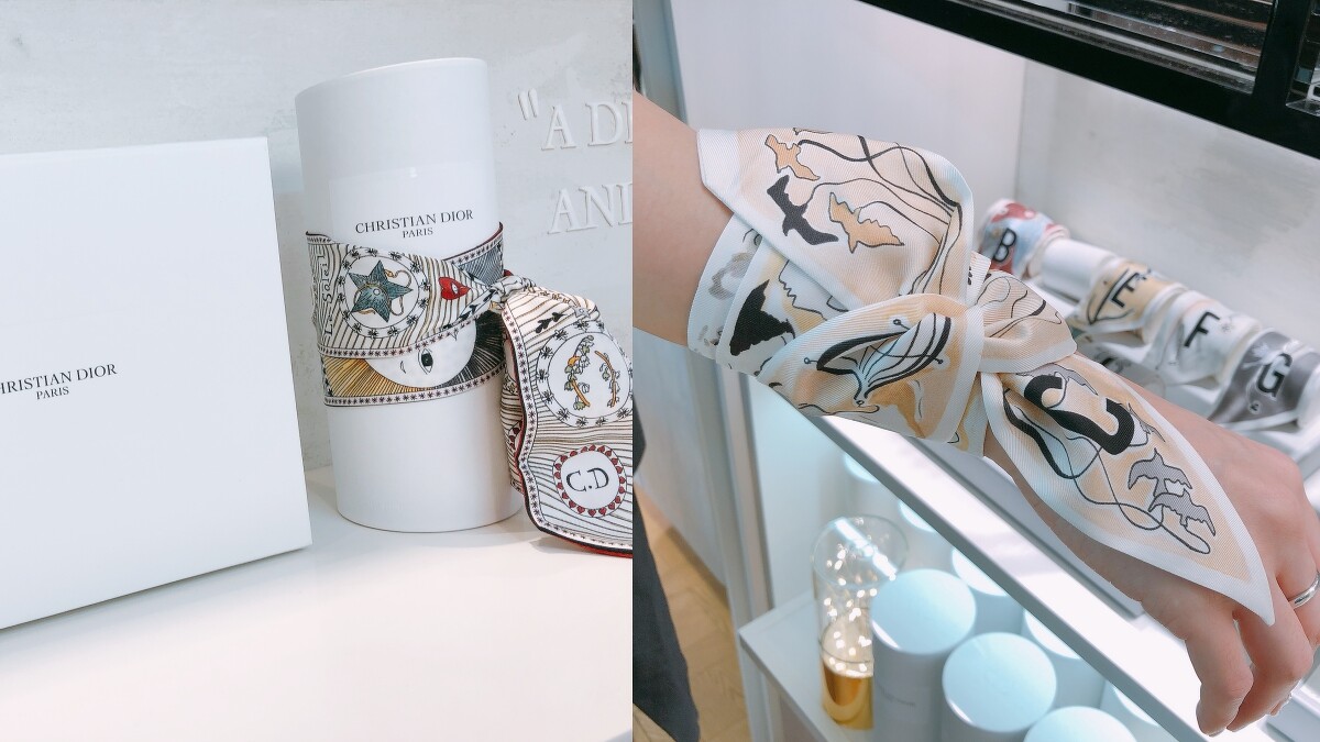 沒錯,迪奧香氛世家也推出了超美絲巾,可以搭配香氛使用。隨意綁在包包或頸間、手腕上,甚至可以用來包裝香水外盒都適合。