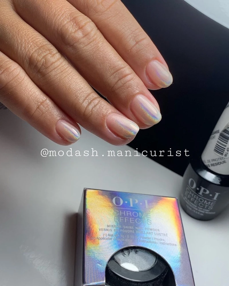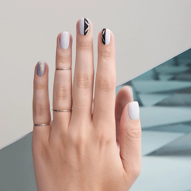 透過能閃耀出如極光般夢幻光澤的鏡面指彩粉,妝點在凝膠甲面上造型變化而成的極光美甲。除了基礎的單色造型,也很適合以裸色、粉色、白色等溫柔色系為底色,點綴於指尖前方製造微漸層感,打造出清新滿分的指尖樣貌。還可以和幾何線條作跳色搭配,創造出個性十足的美甲造型。
