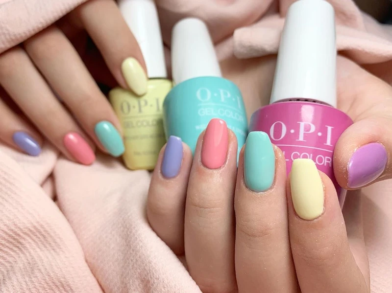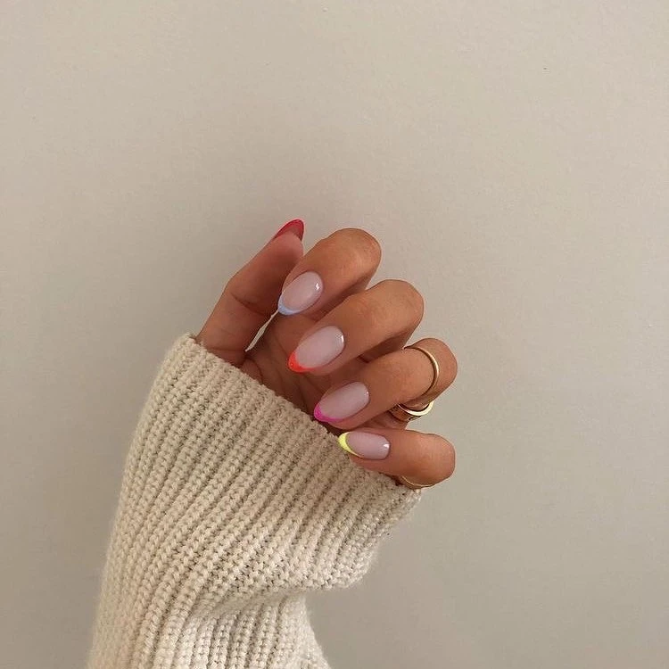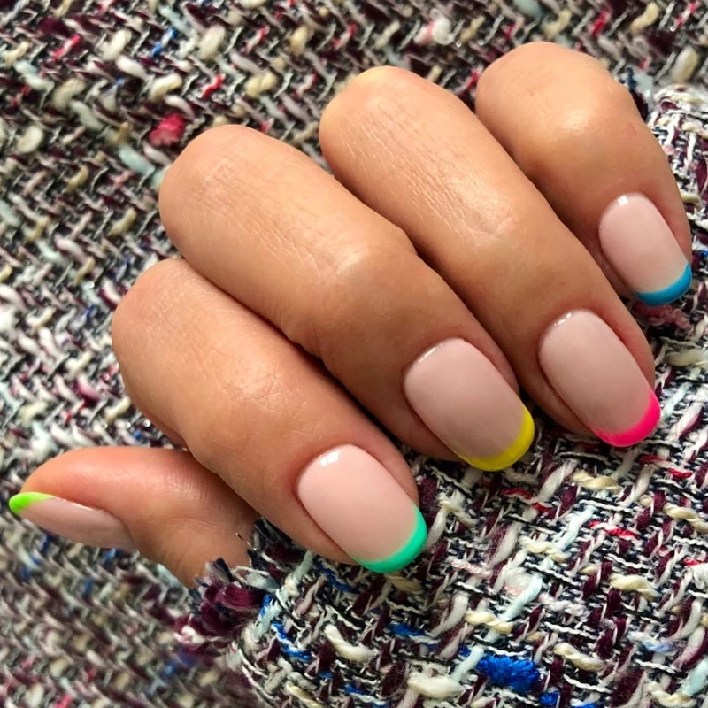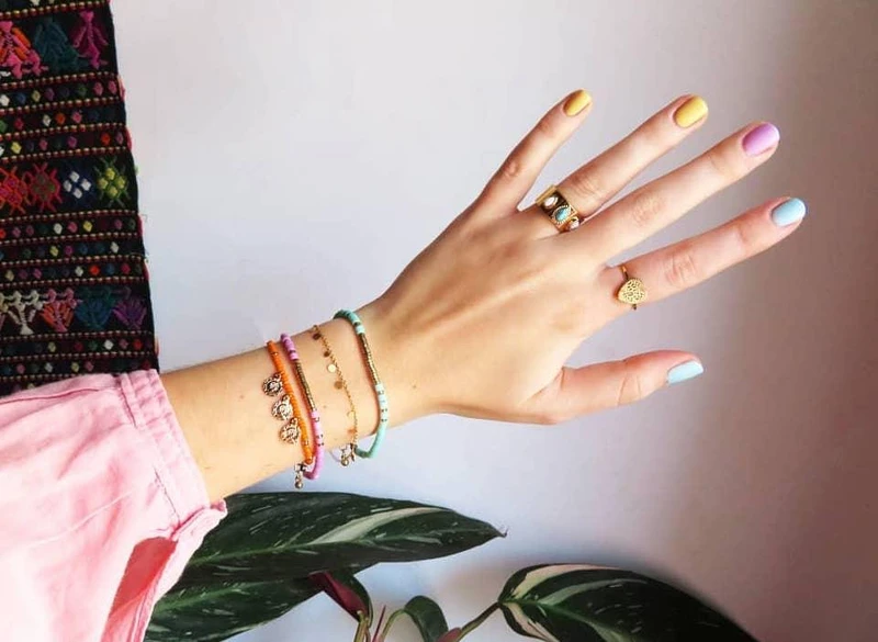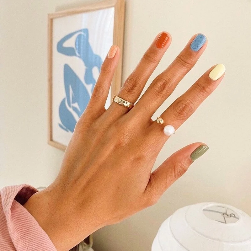以紫色、黃色、綠色、橘色、藍色等亮彩色系,相互混搭於不同指尖所創造出的童趣感跳色美甲,亮眼又顯白,讓指尖瞬間充滿繽紛活潑的氛圍,最適合夏天!