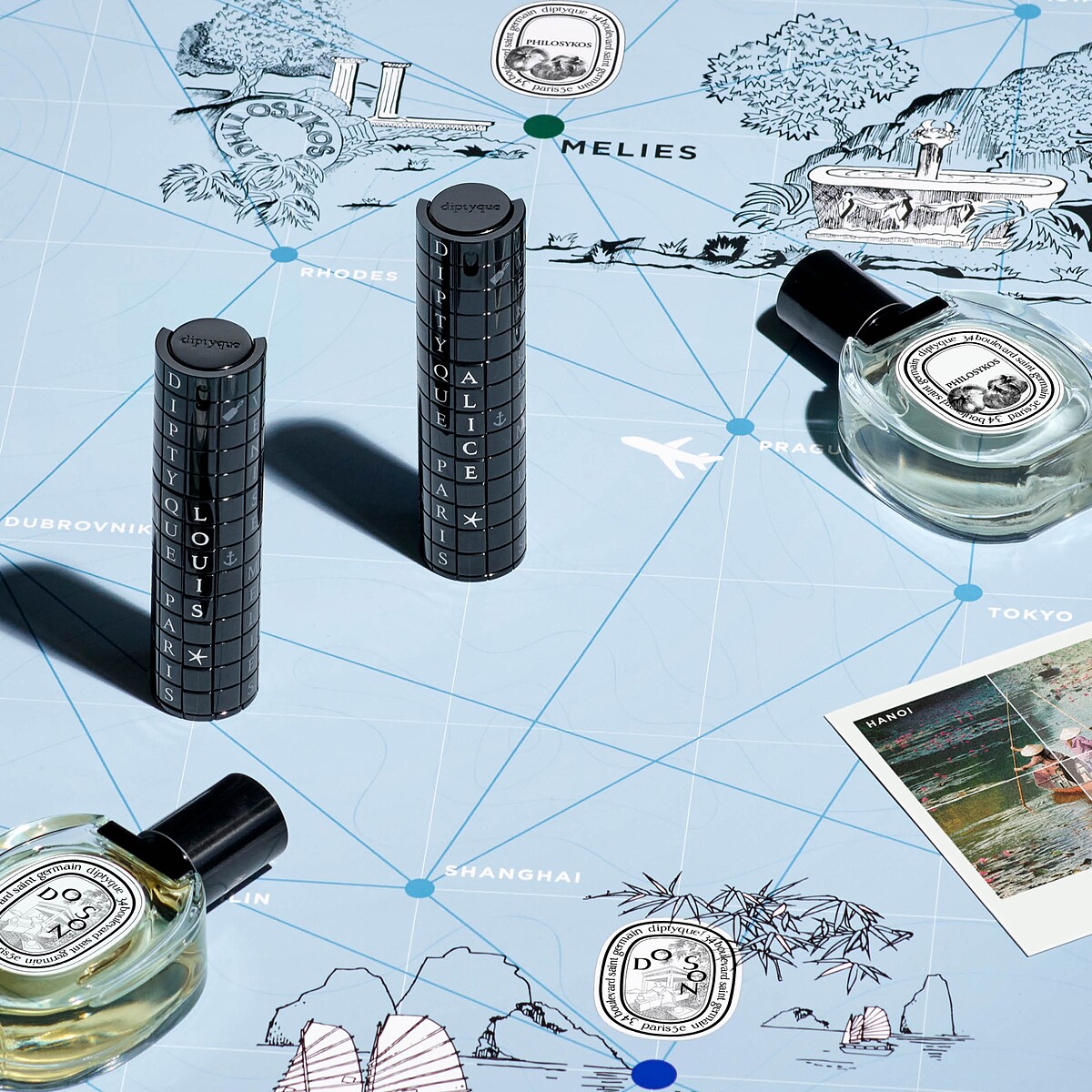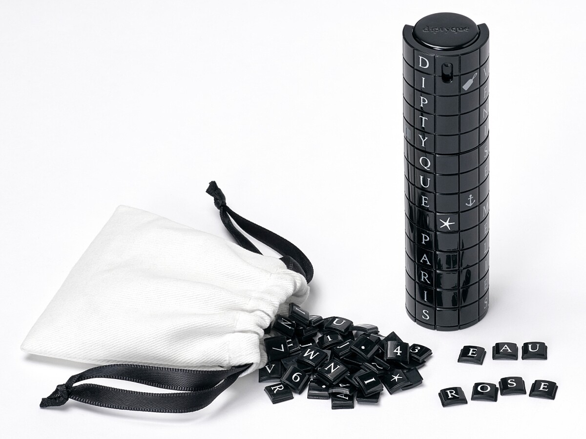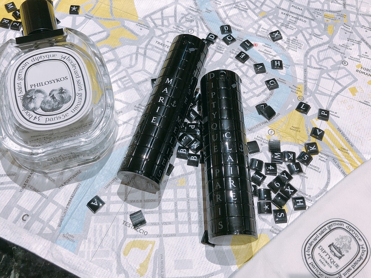 diptyque 旅行裝香水瓶是相當吸睛的黑色圓柱瓶身,寫著各個國家的英文,包括Paris、Tokyo等等,而且仔細看,外殼其實是由無數小方塊拼成。