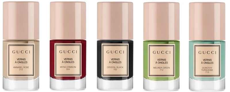 Gucci Beauty秀色在握指甲油首波推出為炎夏打造出的五個鮮明色調:米蘭達綠、多蘿西綠松石、瑪拉緋紅、安納貝爾玫瑰和黑水晶,是設計總監Alessandro Michele最愛的顏色,同時也是Gucci時裝系列裡最經典的顏色,並向鍍金時代的好萊塢經典電影及角色致敬。