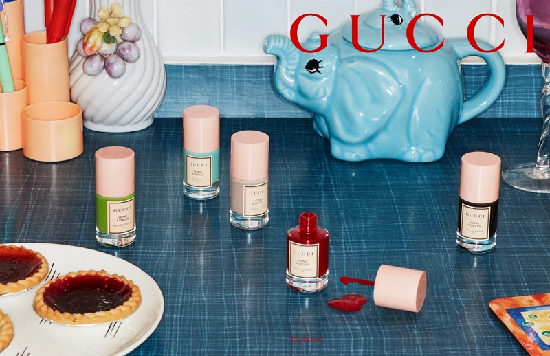 Gucci秀色在握指甲油的廣告影像出自以拍攝非傳統紀錄照片而聞名的英國攝影師Martin Parr之手。色彩斑斕的指甲油放置於復古的廚櫃頂部,與茶水間的必需品-擦拭布、瓶裝鮮橘子汁及果醬罐成鮮明對照,描繪出日常生活中的超現實畫面。