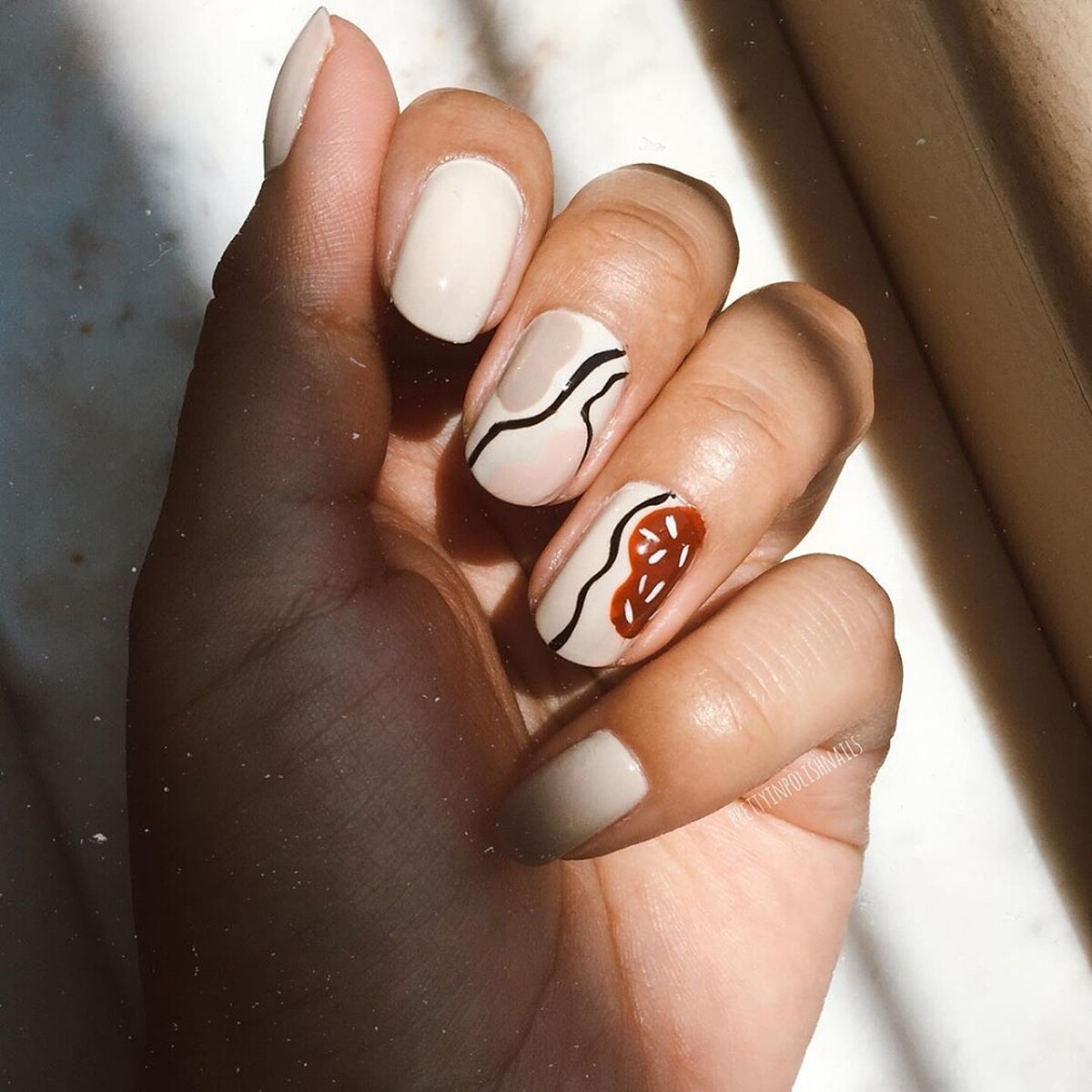 利用線條、色塊、圓點三種不同元素所組合而成的抽象派彩繪美甲,是今年秋冬美甲趨勢中率性俏皮又兼具文青質感的造型,非常適合與毛呢、針織類等材質布料的服飾搭配。還可以進一步選擇霧面質地,更符合秋冬氣息。
