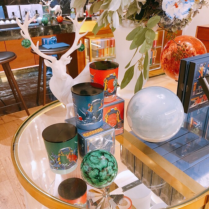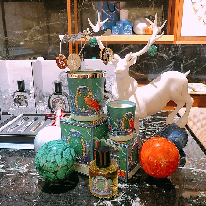 今年找來藝術家Ugo Gattoni合作。故事是從聖誕夜裡的一隻小貓開始,牠出現在在聖日爾曼大道34號diptyque精品店前,接著漫步走向廣場,那裡有座古老噴泉,莊嚴的動物石像環繞四周,彷彿蟄伏千年。貓兒頑皮地伸出雙爪於水中輕探,突然不可思議的事發生了,平靜的水面泛起了漣漪、噴泉處發出呢喃細語,動物們一隻接著一隻醒來了,包括威武剛強的雄獅、神秘優雅的天鵝、活潑忠誠的雄鹿,也就是這次奇幻靈獸聖誕系列的三個主角。