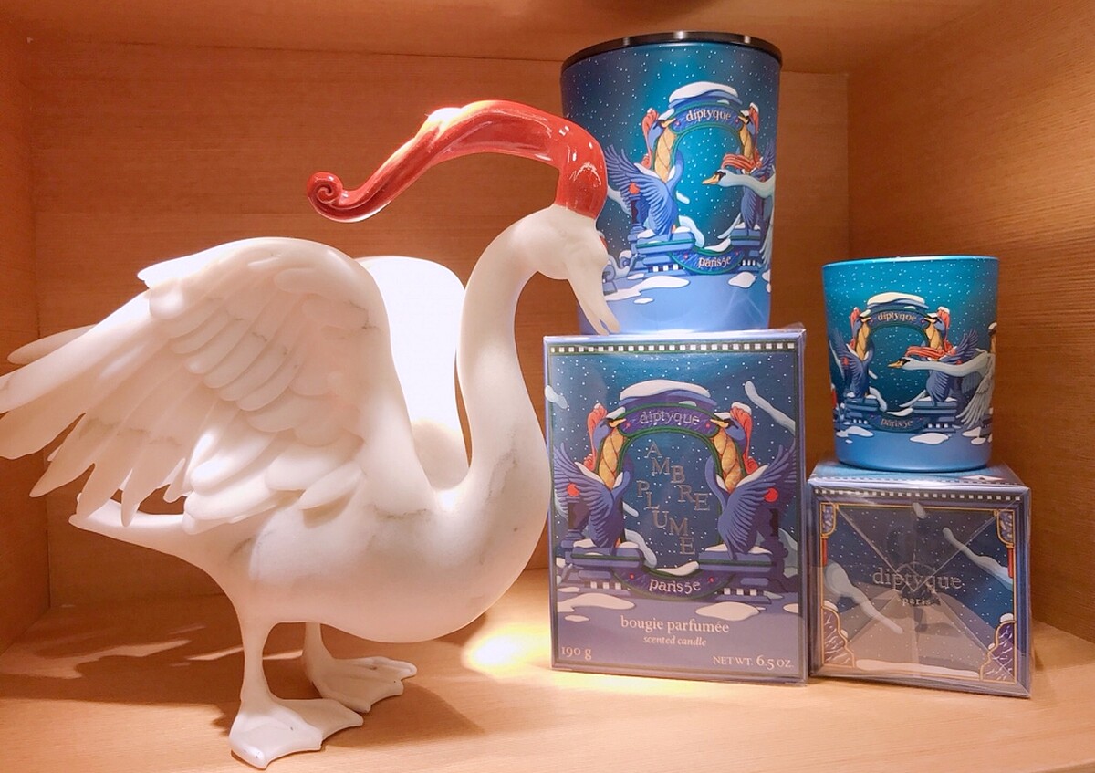 藍色蠟燭搭配天鵝圖案。柑橘香調與暖香氣息,明媚橙香輔以肉桂與生薑氣味,令整體氛圍搖曳生姿,親切可人的琥珀香調更增添一絲柔情蜜意。