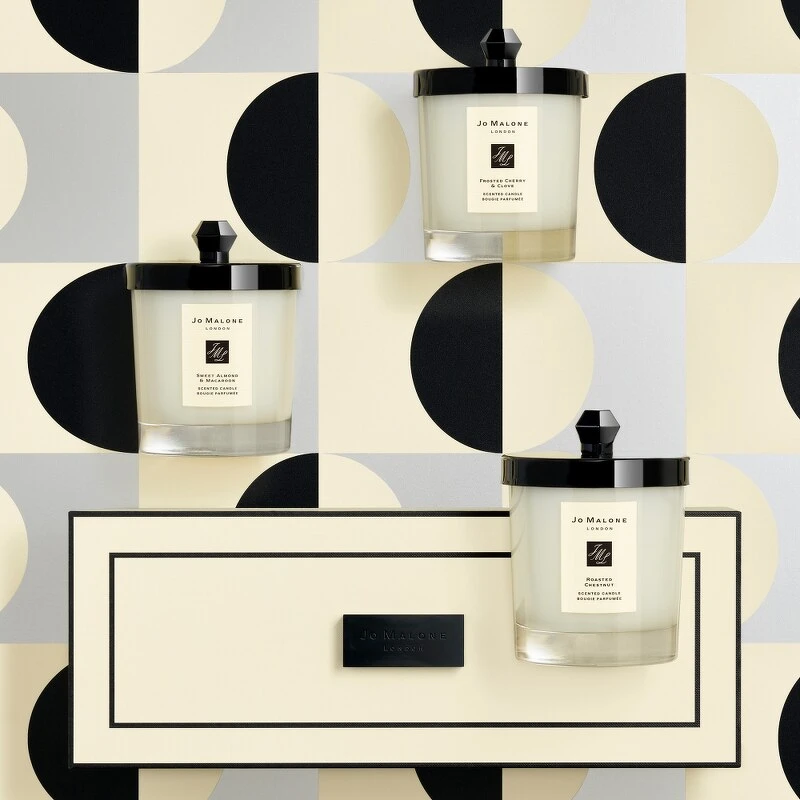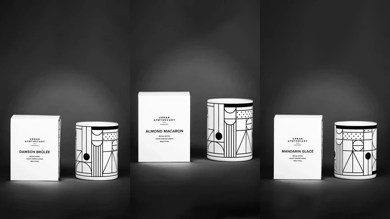 來自英國倫敦的Urban Apothecary ,每一顆蠟燭皆於品牌位於萊斯特郡的工廠手工罐製,確保品質無虞,2020的聖誕節他們推出三款以甜點為靈感的香調,分別為:焦糖布蕾、柑橘太妃糖,和杏仁馬卡龍,瓶身上跳脫原有的全黑設計,此次限定款以霧面玻璃瓶身搭配生動的黑色普普風極簡幾何圖紋,可愛中不失品牌原有的簡約質感風格。