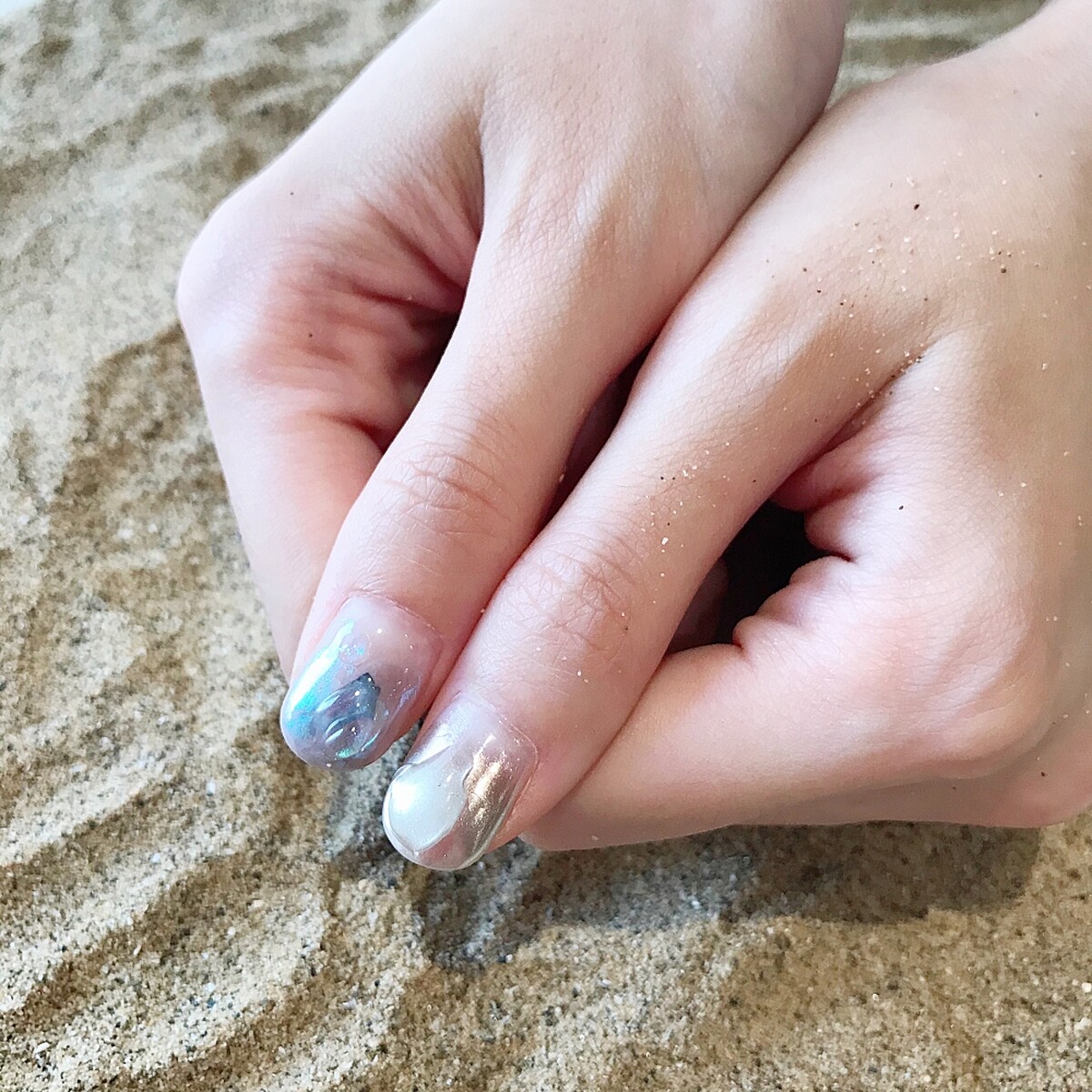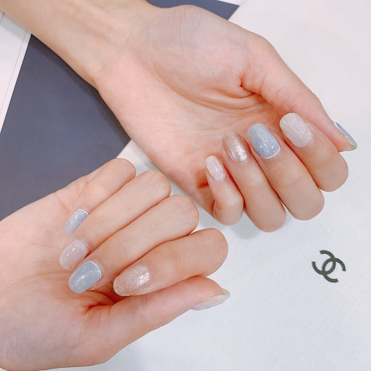 這一季立體透明凝膠、鏡面粉的異材質運用是趨勢,利用立體透明凝膠創造水滴曲線流動感,為了讓鏡面的質感不那麼沈重,因為美甲教育總監Becca用漸層、藍色系、金箔的暈染,再加上貝殼片的點綴,像是在陽光照耀下閃耀的海洋,清爽卻時髦。