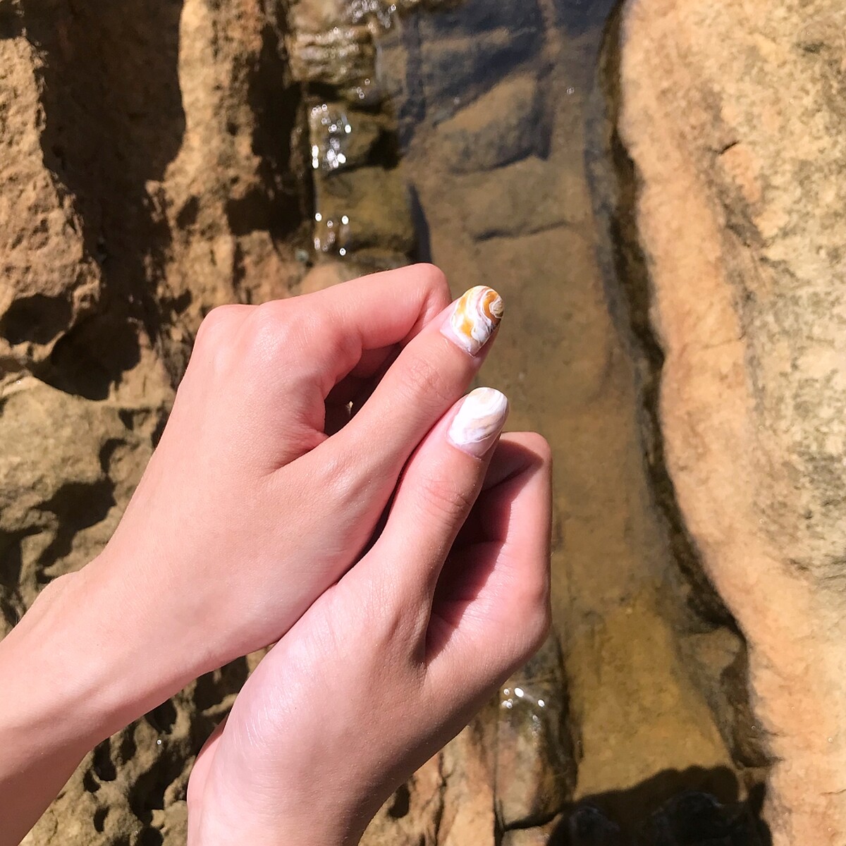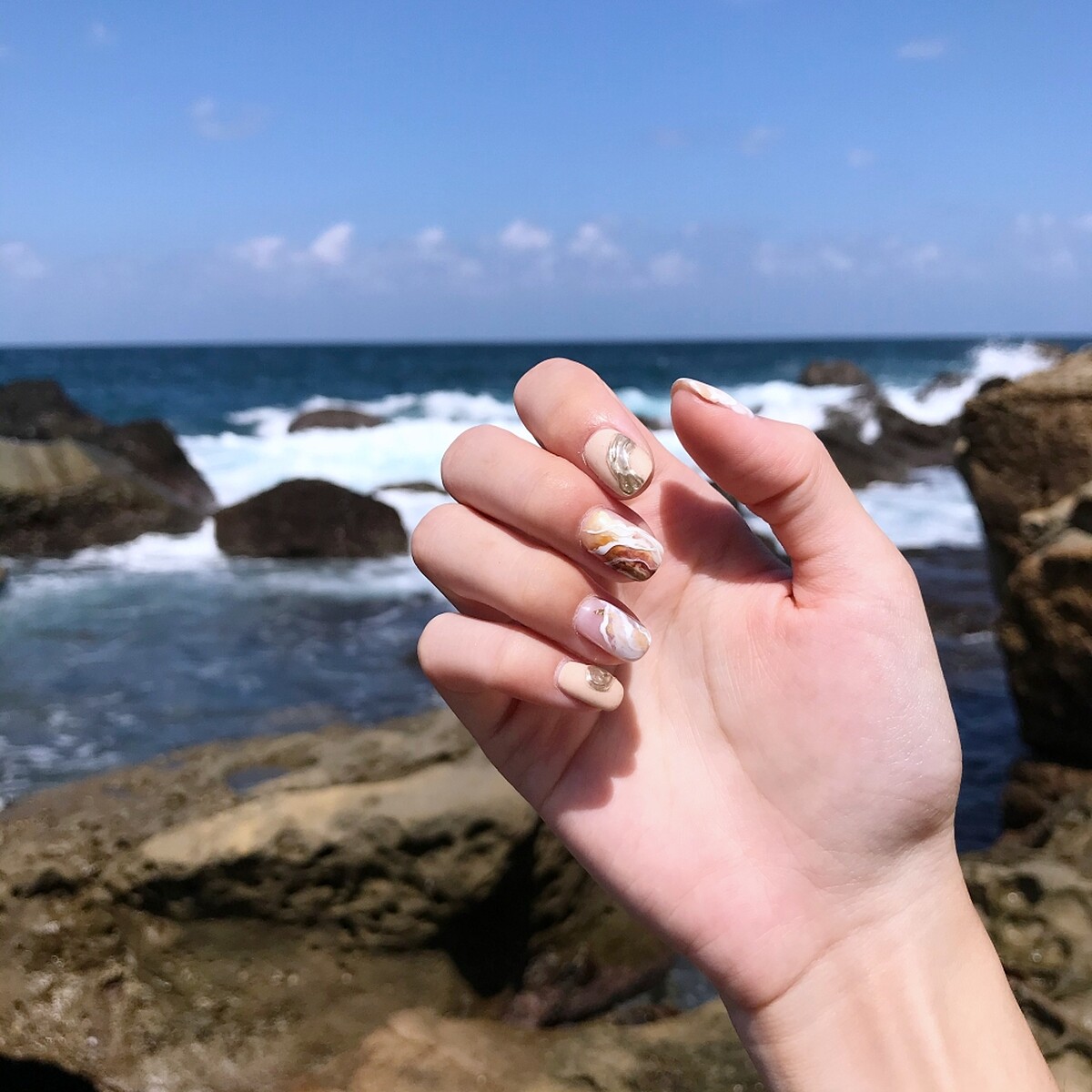 以「海洋地質學家」為靈感來源,採用了流沙暈染的手法,使用仿石色彩,特別使用立體凝膠創作不規則形狀的點綴,再鋪上鏡面粉,就如海邊岩石,特別生動。