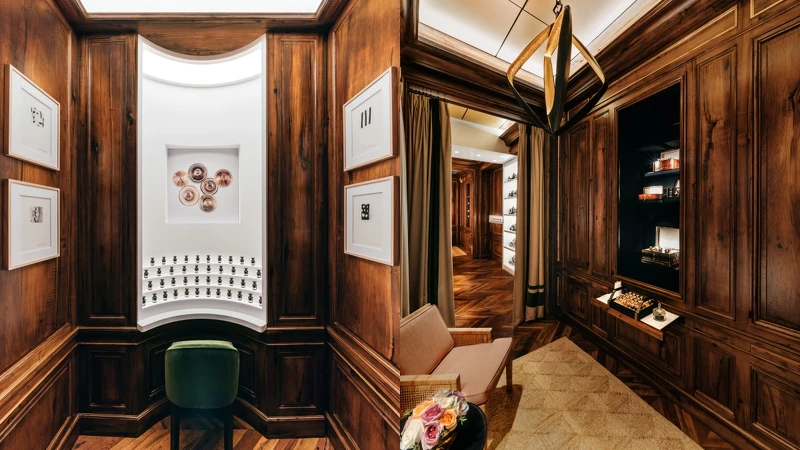 舒適的休息室內裝飾著窗簾、天鵝絨小凳和Bergère1930扶手椅,牆壁上掛著日本藝術家黑田明的版畫作品,為香水愛好者們提供了一個私密空間,追隨自己的節奏探尋最鐘愛的味道。這裡隱秘的陳列櫃和古董箱內保存著珍貴的香氛傑作Les Exceptions系列、巧奪天工的香水瓶及收藏家搜羅而來的配飾。
