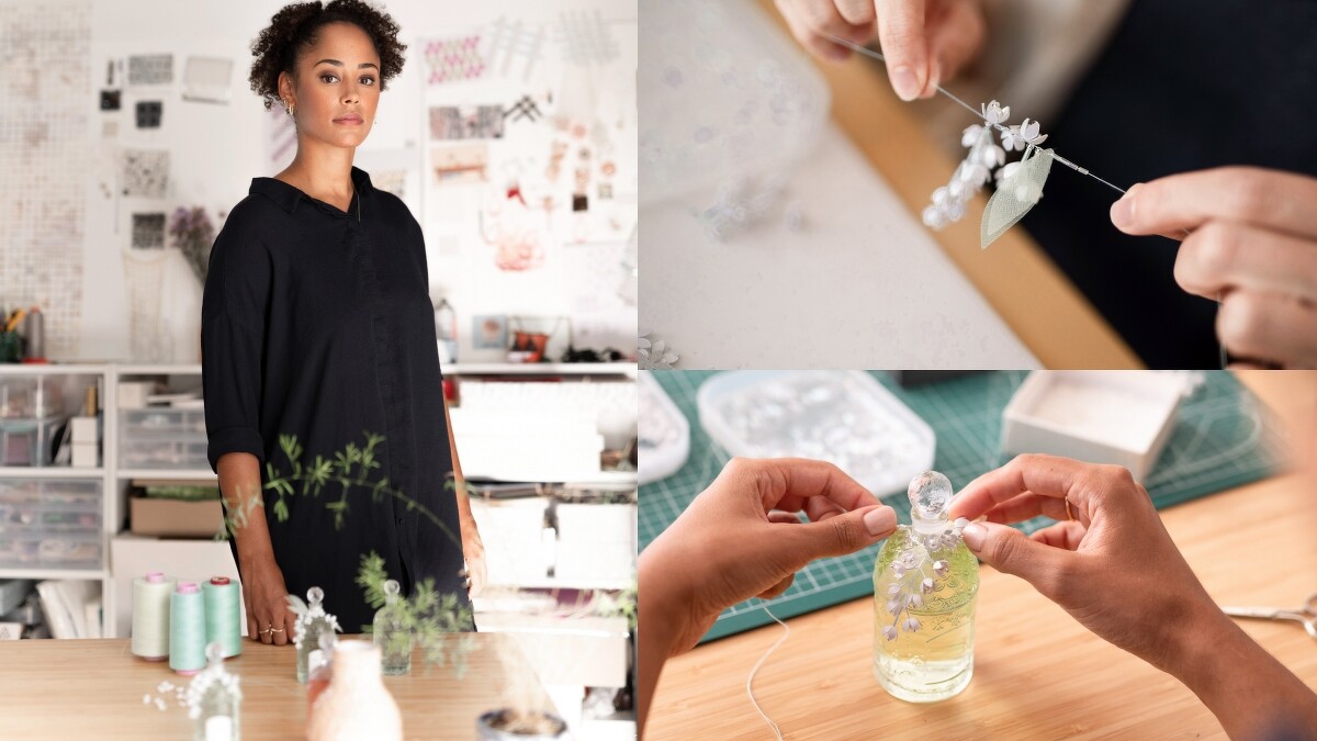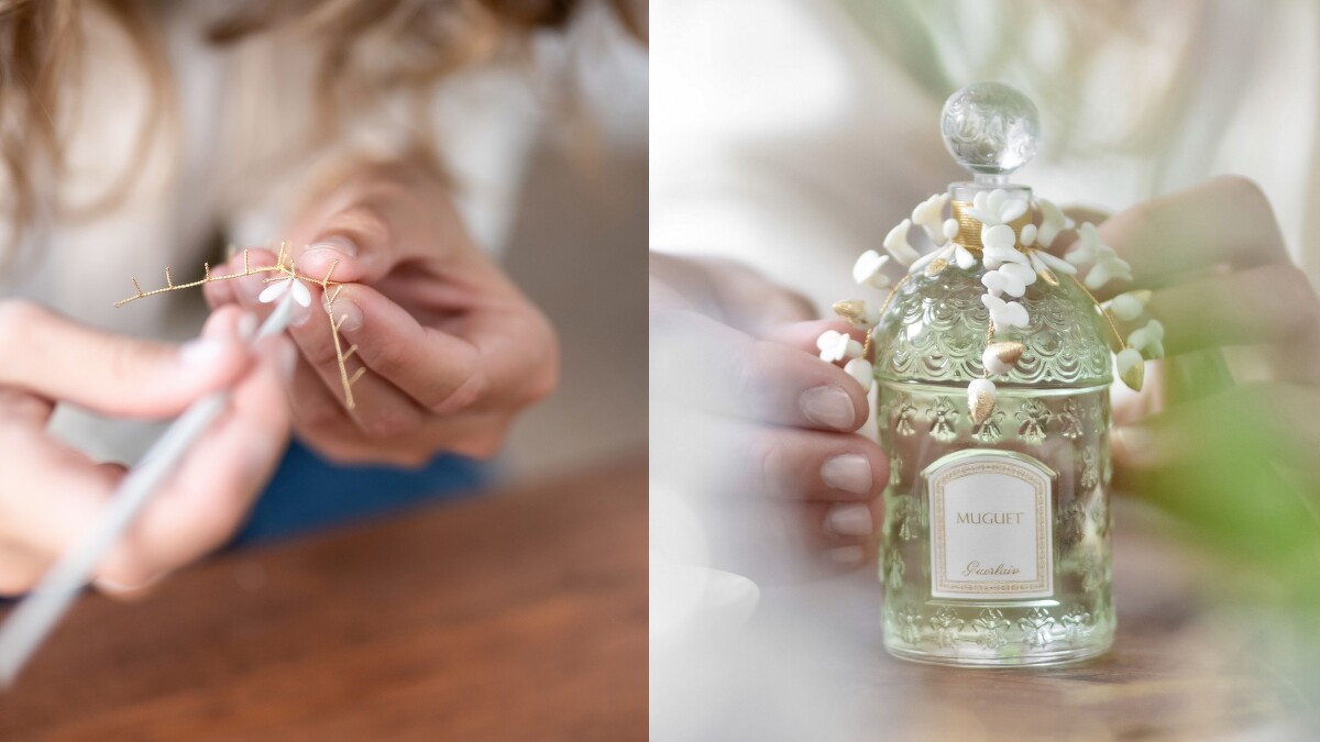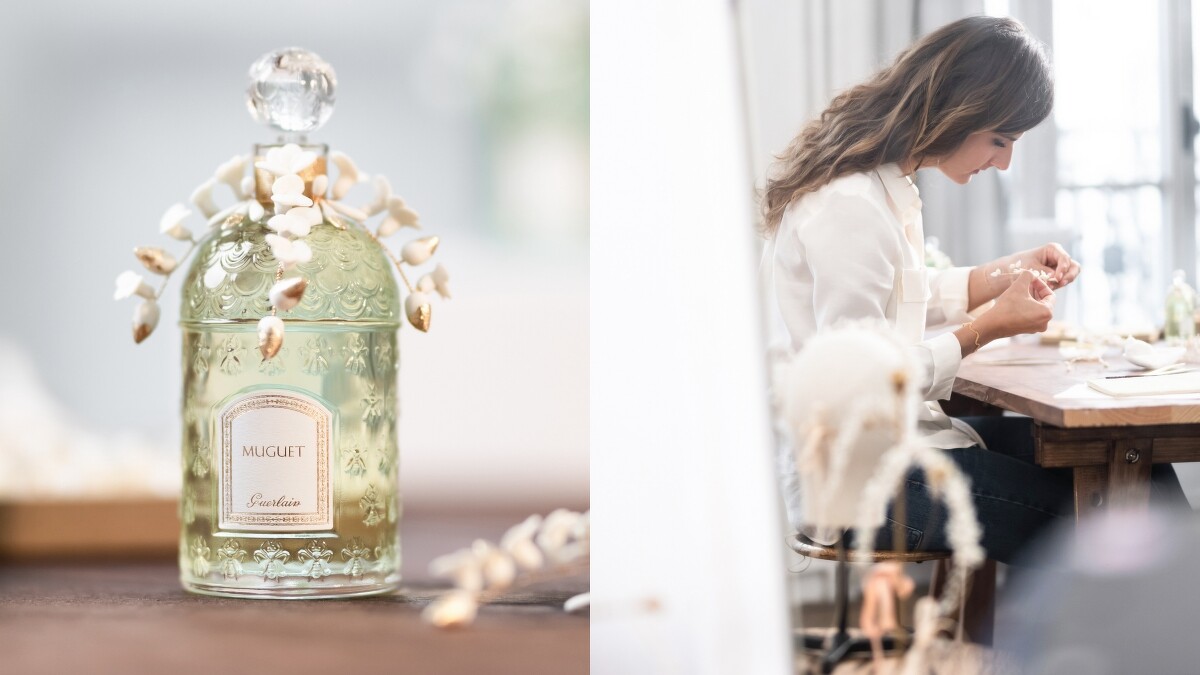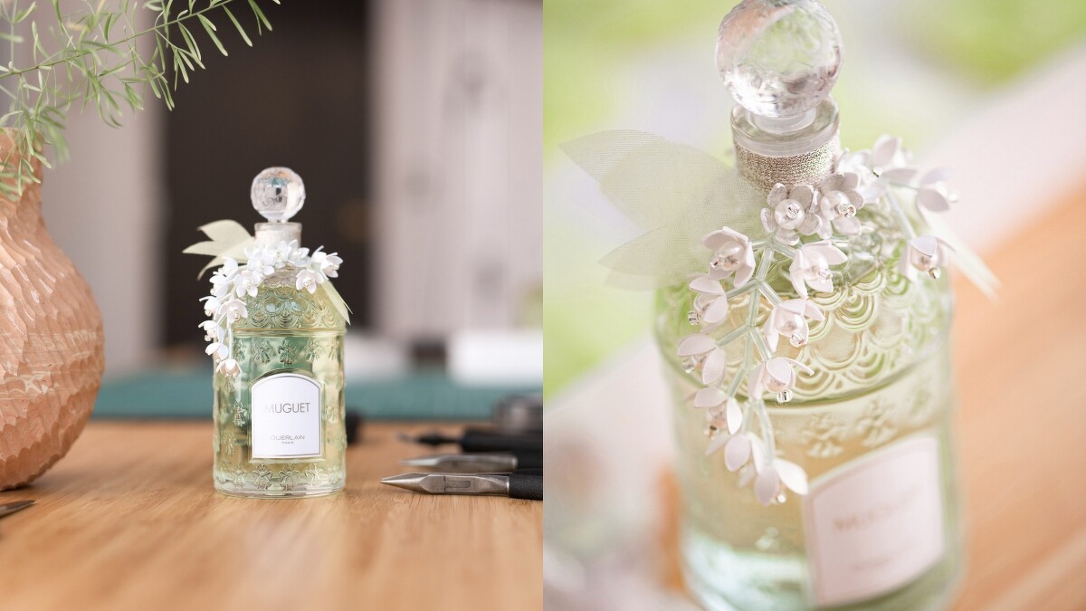 為歡慶五月一日法國鈴蘭節,嬌蘭每年都會替裝著Muguet鈴蘭的經典蜂印瓶換上新裝。由於2023年正值蜂印瓶誕生170週年,今年的裝飾比以往更加華美,由法國知名陶瓷藝術家卡倫•斯瓦米(Karen Swami)和高訂服裝刺繡工作室 Vermont工坊(Les Ateliers Vermont) 兩位藝術工藝大師,以珍貴的嬌蘭鈴蘭香氛為靈感,打造出一件匠心獨具的陶瓷及刺繡裝飾。