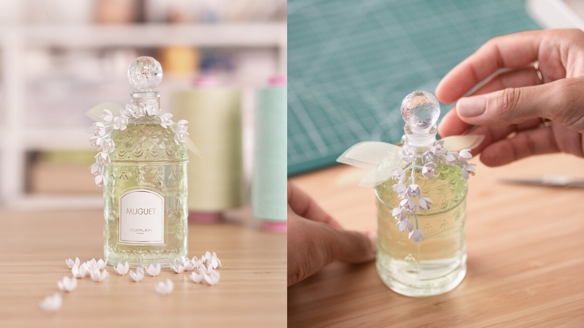 為呈現葉子的柔軟度,嬌蘭特邀高訂服裝刺繡工作室Vermont工坊(Ateliers Vermont)製作了一款極具巴黎風情的夢幻薄紗蝴蝶結,紗上繡著鈴蘭花枝,繫在這款經典香水瓶的瓶頸,宛如最優雅的幸運符。