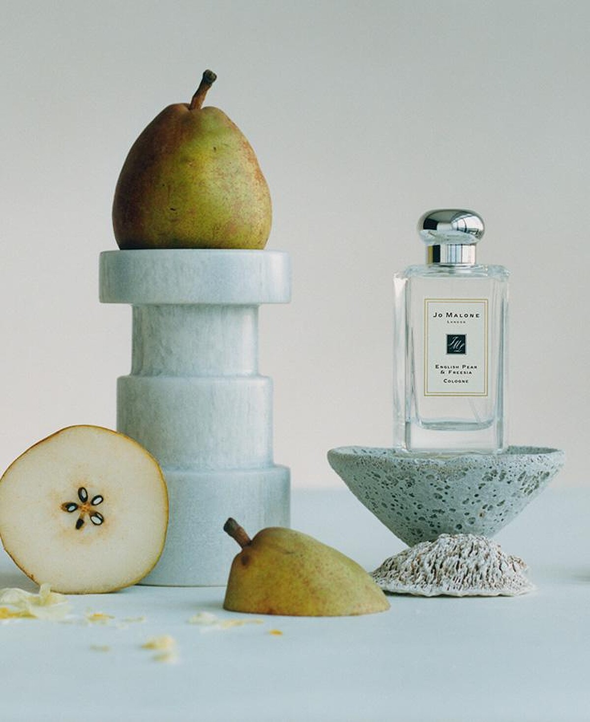 Jo Malone London最具代表性的香氛,不分男女皆能愛上這股清新,英國梨與小蒼蘭香味靈感來自純正的英倫貴族血統,調香師Christine Nagel讀了英國詩人濟慈的詩歌,裡面訴說著漫步在田野間的少女髮絲隨風飛揚,淡雅香氛使人沉醉,調香師驚覺原來簡單平凡才是轉換心情的關鍵,於是他希望調製一款香水,讓逐漸進入秋冬陰雨綿綿的英倫生活跟過去不同,將當時英國皇室到平民都喜愛的秋日果物--威廉梨,飽滿多汁,清新香醇,甜中帶酸的特色,搭配溫柔恰好的小蒼蘭,再調入中性的廣藿香和白麝香,在英倫傳統神祕貴族氣息中帶出明亮活力,剛剛好的親和力在當時療癒了所有人的心,至今無人可取代英國梨與小蒼蘭那所有一切都剛好的清甜溫潤香味。