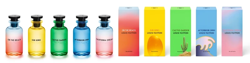 LV路易威登(LOUIS VUITTON)2019年推出古龍水香水系列(Cologne Perfumes),描繪柑橘味輕盈水霧和深邃花香間的完美結合。 最初有三款:Sun Song是陽光令人愉悅的愛撫、Cactus Garden漫步穿越異國風情陽台、Afternoon Swim潛入歡愉的海洋,2020年加入第四款California Dream日落的魅力,完成美妙的四重奏旋律。