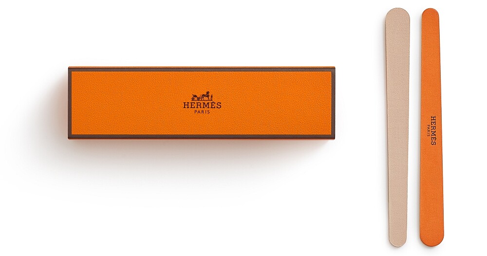 採用來自永續經營森林的白楊木製成的美甲銼刀,精緻包裝在量身訂製的橘盒中,一盒共有十二支。尺寸適中,柔韌的材質使美甲動作更得心應手,顏色也是令人難以抗拒,一面是經典的愛馬仕橘,另一面則是米色。米色面的顆粒較粗些,能夠快速修出想要的指甲形狀、橘色面的顆粒較細緻,適合用來潤飾修整。 這是品牌所推出的最小配件之一,但這實用的美甲 銼刀也巧妙呼應了新款「雙面」印花絲巾或是喀什米爾 羊絨和皮革披肩的風格!