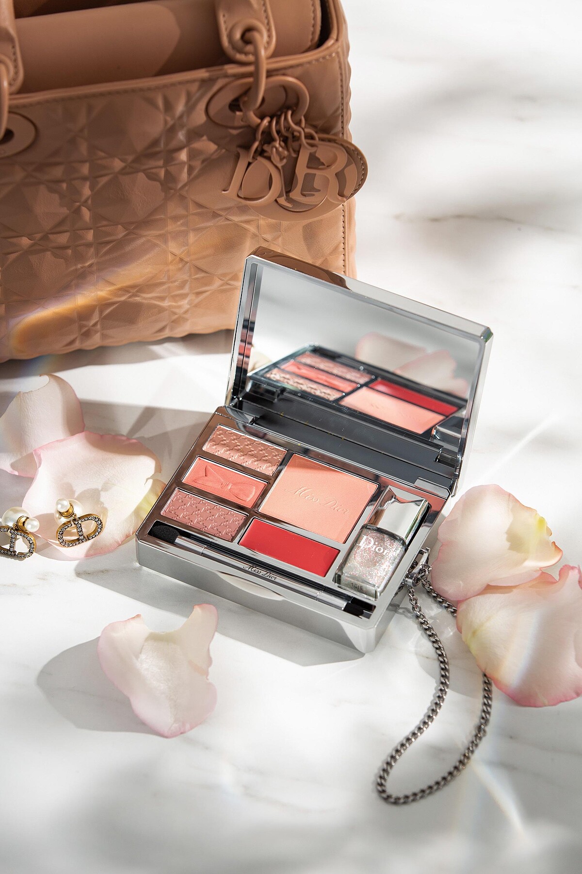 撩心秘訣不只香味,還有粉嫩戀愛妝容,讓他忍不住想一親芳澤!Dior情人節首次推出「Miss Dior愛戀全妝盤」,就是高甜度女友妝的秘密武器,內含豆沙玫瑰色眼影、腮紅、唇膏,甚至還附上一瓶星砂閃爍的指甲油!重點是眼影與銀盒雕刻著精緻的千鳥紋+Miss Dior單耳蝴蝶結,打開瞬間就墜入愛河!「Miss Dior愛戀全妝盤」還貼心附上綴有CD Logo銀鍊、雙頭眼影刷,輕鬆就能打造戀愛般好氣色容顏、再創顏值高峰,連指尖小細節都幫你顧好好~最後別忘記穿上Miss Dior香氛隱形外衣,把自己變成天生的愛情體質!