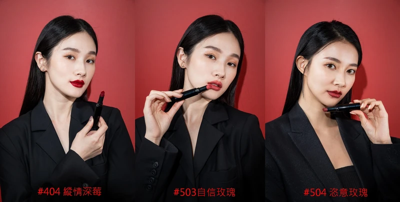 去黃顯白威力超強的#404 縱情深莓,就算前天熬夜氣色差,只要有這款紅絲絨蛋糕色馬上就亮到無極限!如果妳是甜美系的女孩那麼#503伯爵茶玫瑰色絕對要收,毫無殺傷力的顏色,讓人好想親近妳!最後情人節的必殺色就是#504恣意玫瑰,性感炸裂,魅惑滿分