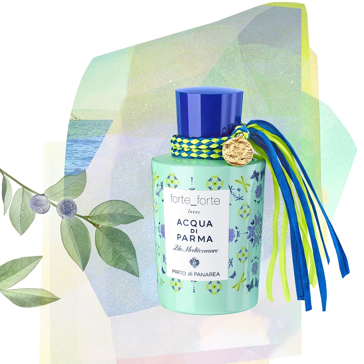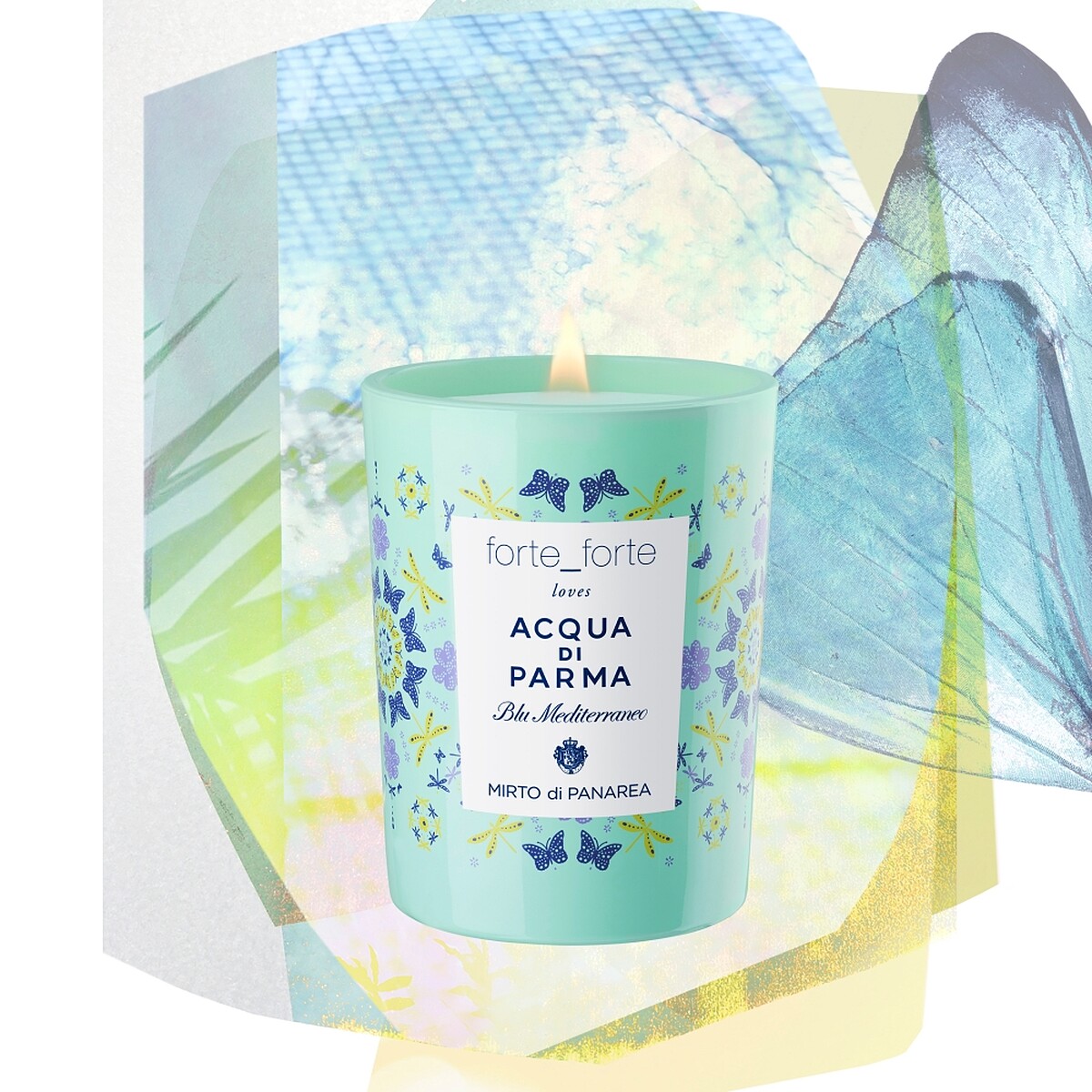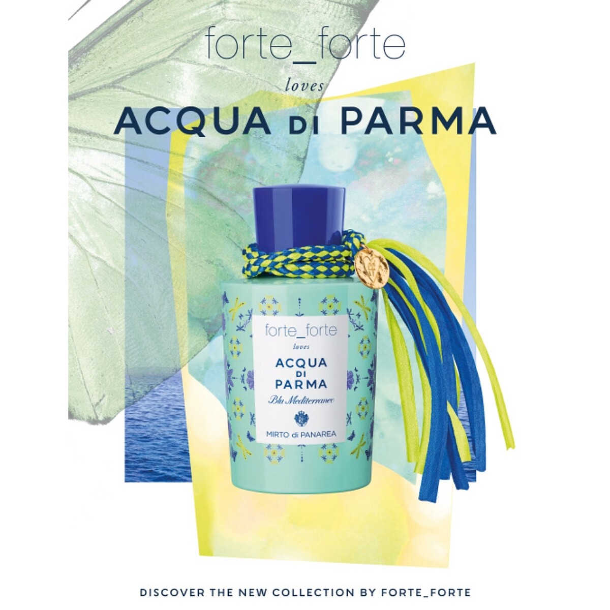 「forte_forte loves Acqua di Parma」視覺靈感來自帕納里亞島鮮亮活潑的氛圍,蝴蝶和蜻蜓展開繽紛的翅膀,舞動在自由和重生中,經典的帕爾馬黃與桃金娘果實的紫羅蘭色相互輝映。