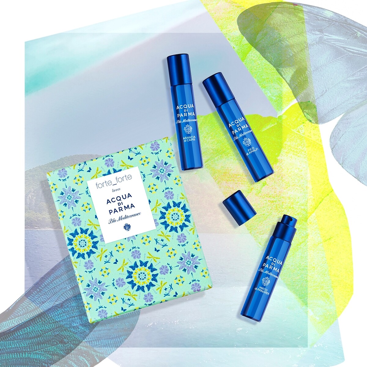 禮盒包含三款12ml藍色地中海熱門香水:帕納里亞加州桂、卡布里香橙、阿瑪爾菲無花果。禮盒覆蓋上forte_forte鮮亮圖騰,帶領大家探索義大利地中海的純粹精隨。