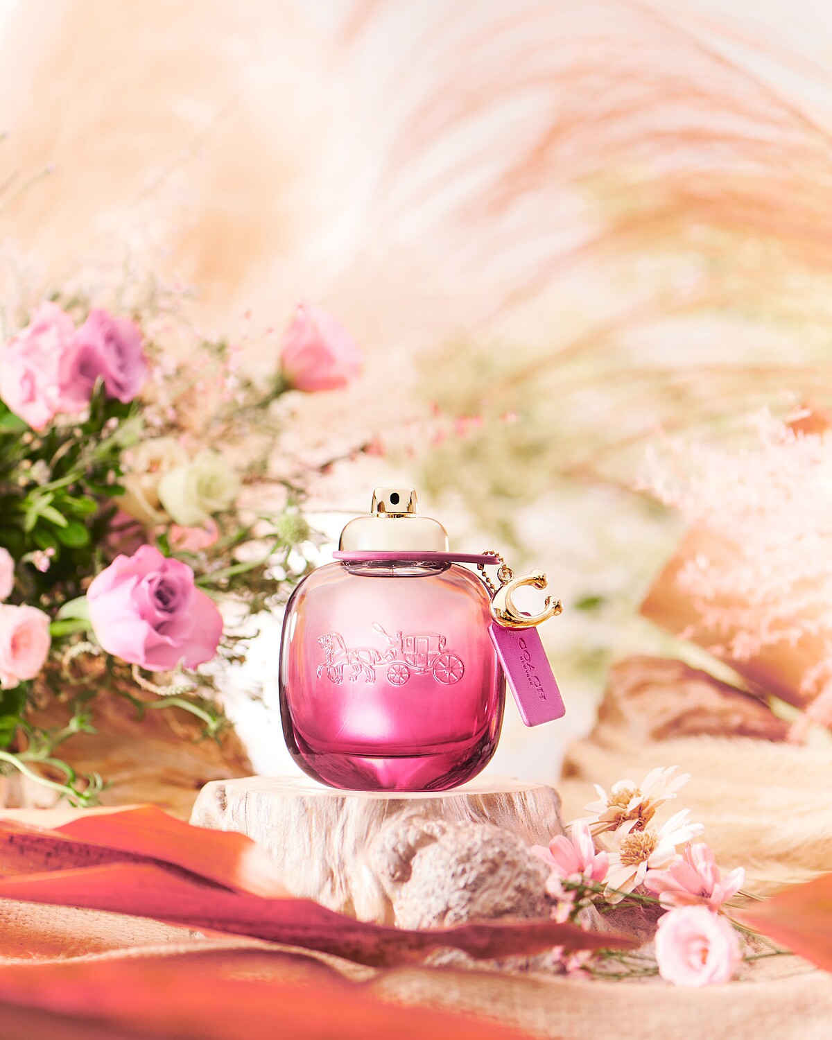 COACH 精緻皮革工藝結合搶眼紅瓶,給女孩的玫瑰香氛花束