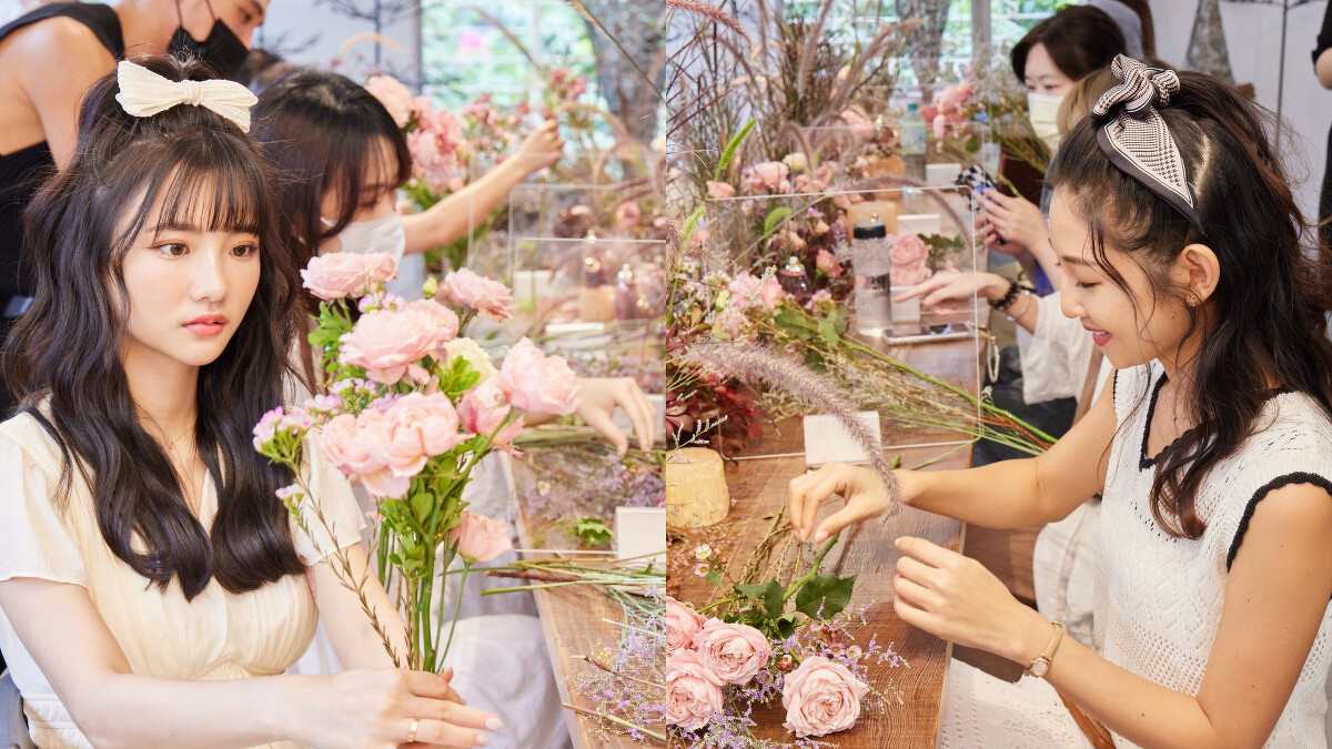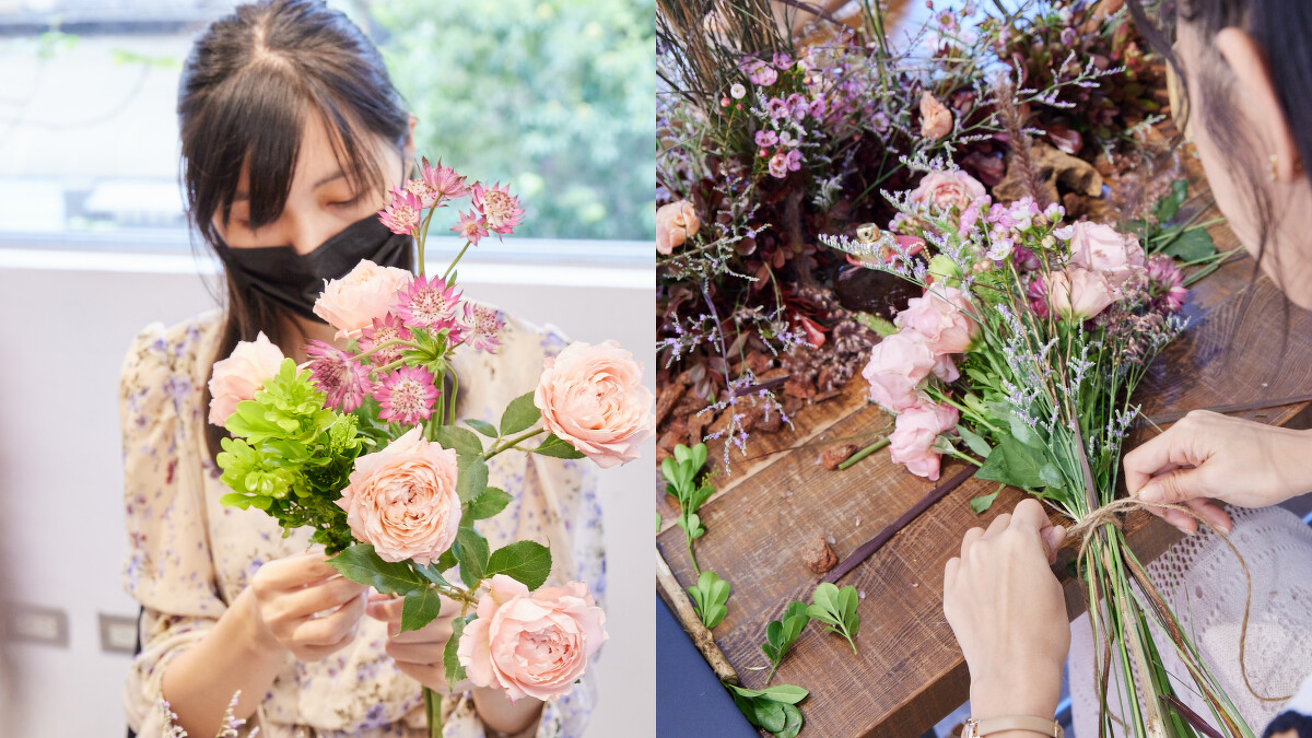 正式手作前花藝總監Turkey先帶大家一一認識了這次使用的花材,大家都對有著可愛名字的泡泡玫瑰印象特別深刻,不但呼應著香水的玫瑰主香調,更有種美麗又神秘的氛圍,就是獨特的存在。在老師親自示範手作綁花的過程中也提到,其實綁花跟香水一樣也分為前中後調,以中心的泡泡玫瑰為主視角,疊加不同花材做出顏色的視覺漸層,就會是更有質感的作品。