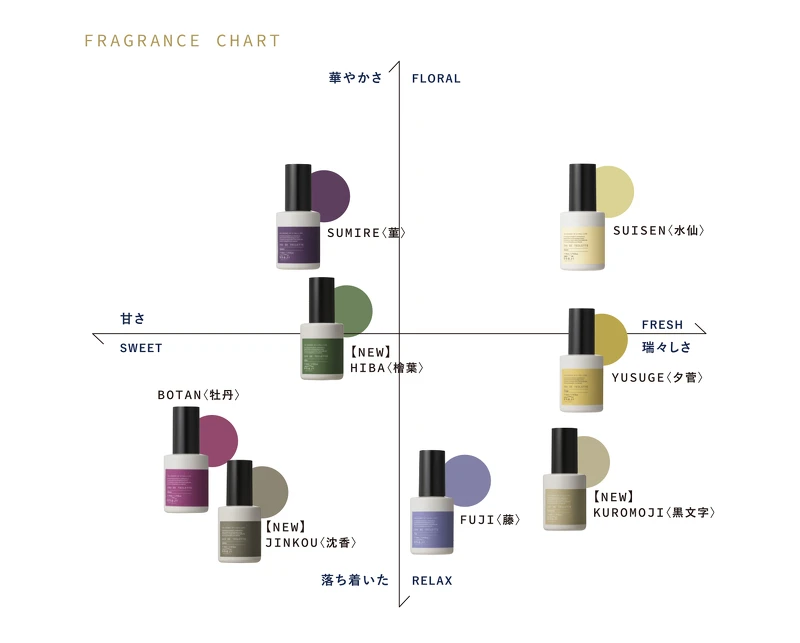 香水則是從日本人熟悉的香氣下手,聲音、顏色、花草樹木等,目前一共有八款香氣,在日本也有調香體驗的活動可以報名,以香氛來說也算是親民好入手的價位。不同季節也會推出限定氣味,讓人忍不住想入手蒐藏。