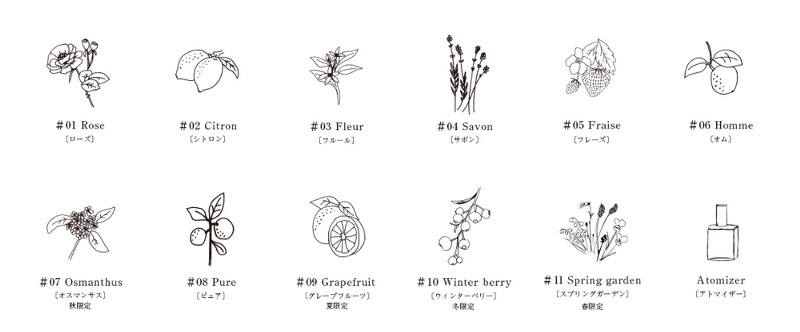 目前加上季節限定的香氛一共有11款,主打以天然香調成分組成的淡雅香氣,整體而言是比較偏清淡、柔和的香味,雖然持久度沒有這麼高,但無侵略性的氣息很受日本女孩喜愛。圓罐護手霜也跟著香水的香氣製作,同樣也是品牌的熱門產品。