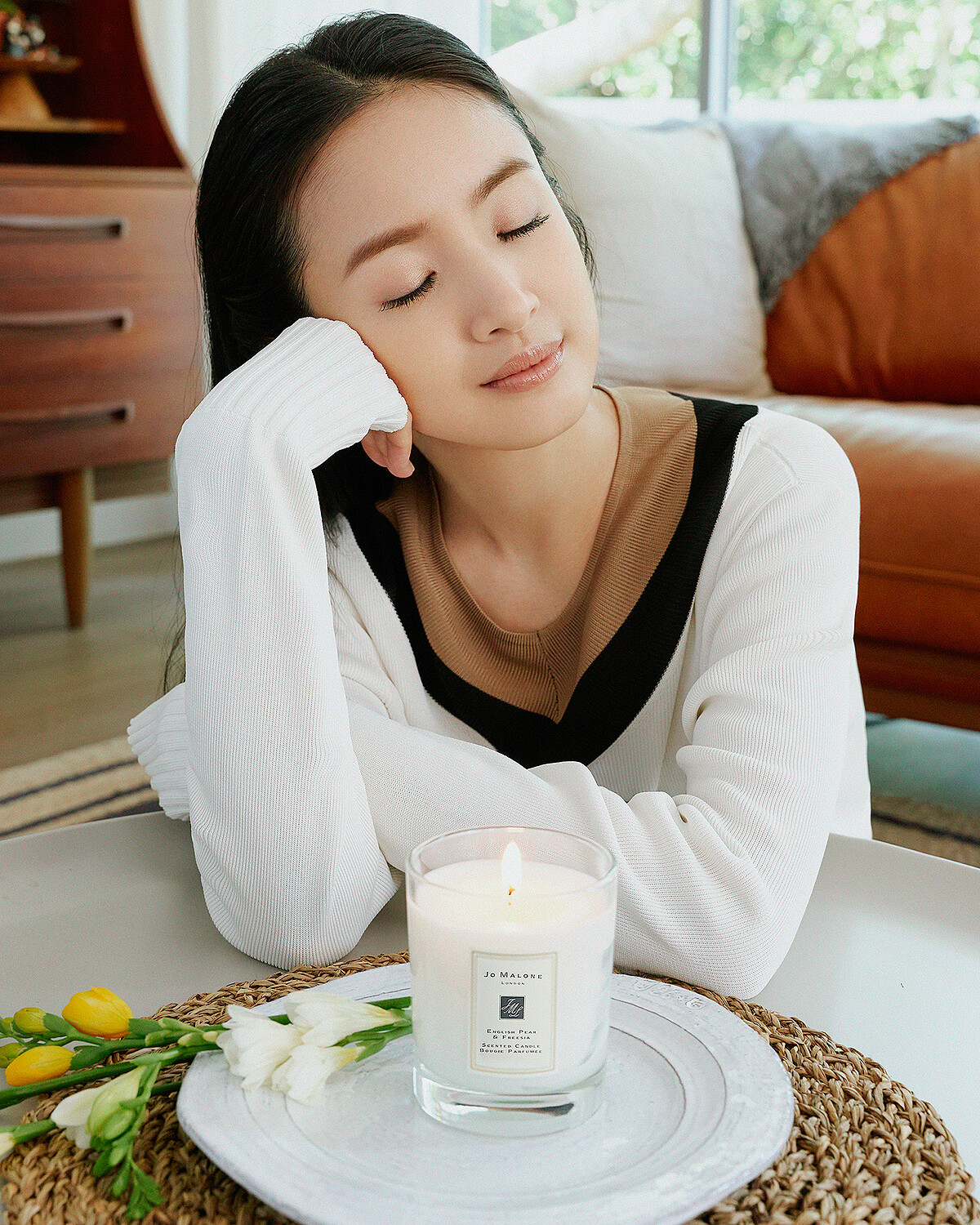 林依晨分享自己的「呼吸療癒法」,做法是選一款你喜歡的香氛或蠟燭,讓自己沈浸在舒服且安心的味道裡,靜下心,重複做幾次緩慢而深長的深呼吸,透過香氣讓自己雜亂的思緒變得平靜,而多年來讓她一直鍾情的味道,就是Jo Malone London英國梨與小蒼蘭,清新溫柔、乾淨中帶點甜的香氣,融入廣藿香琥珀木質調,把讓人感到愉悅、心情平靜的香調完美調和在一起,放在臥室能幫助入眠,放在家中的各個角落,鬱悶或想放鬆時,點亮小小燭光感受這絲滑清甜香氣,彷彿被溫暖的微風輕柔擁抱,是最舒服又愉悅的事!她也會在浴室、廚房放上香調不同的Jo Malone London香氛工藝蠟燭,隨時放鬆療癒心情。