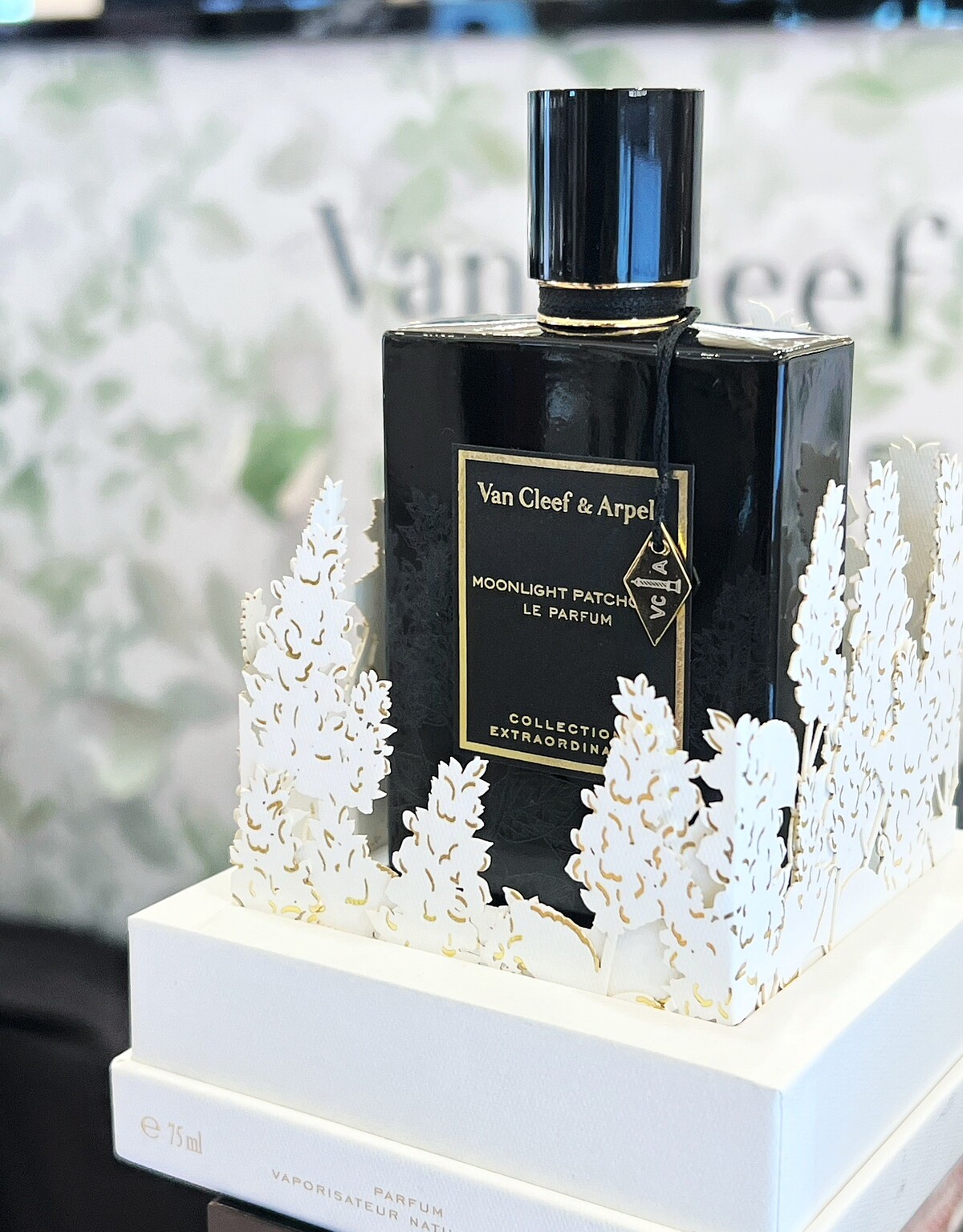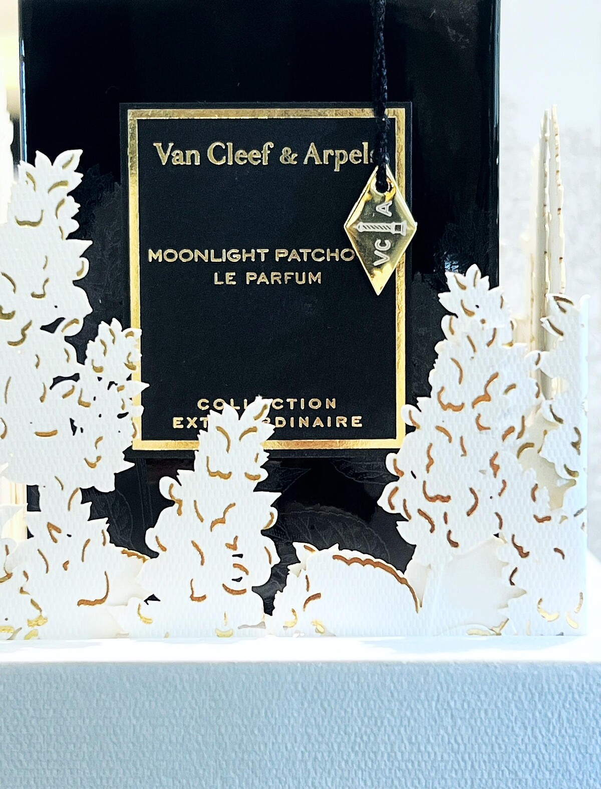 香精版本與其它成員的不同之處在於,瓶頸處纏繞的絲線由咖啡色替換為墨黑色,黑色絲線上垂掛著金色吊牌,瓶身中間的品牌標籤以墨黑色為底,燙金的品牌名稱、標籤周圍以金邊圍繞,在月夜下是最璀璨閃耀的存在。精緻地剪紙葉片上葉緣勾勒著金邊細節更顯奢華與珍貴。標誌性的黑色漆瓶與精緻的金色細節形成對比,讓它在光影之間搖擺不定,增添一抹神秘氣息。