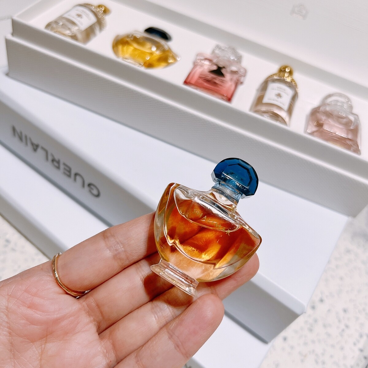 內含五款嬌蘭經典香水,包括輕快明亮的柑橘香氣(花草水語陽光甜橘淡香水)、兩款經典的琥珀香氛(SHALIMAR一千零一夜淡香精、MON GUERLAIN我的印記淡香精)、兩款花果香調(法式黑裙淡香精、花草水語晨霧玫瑰淡香水)。