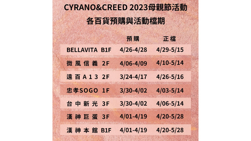 快去CYRANO席哈諾專櫃與CREED精品店逛逛尋香,母親節檔期滿額贈好精彩