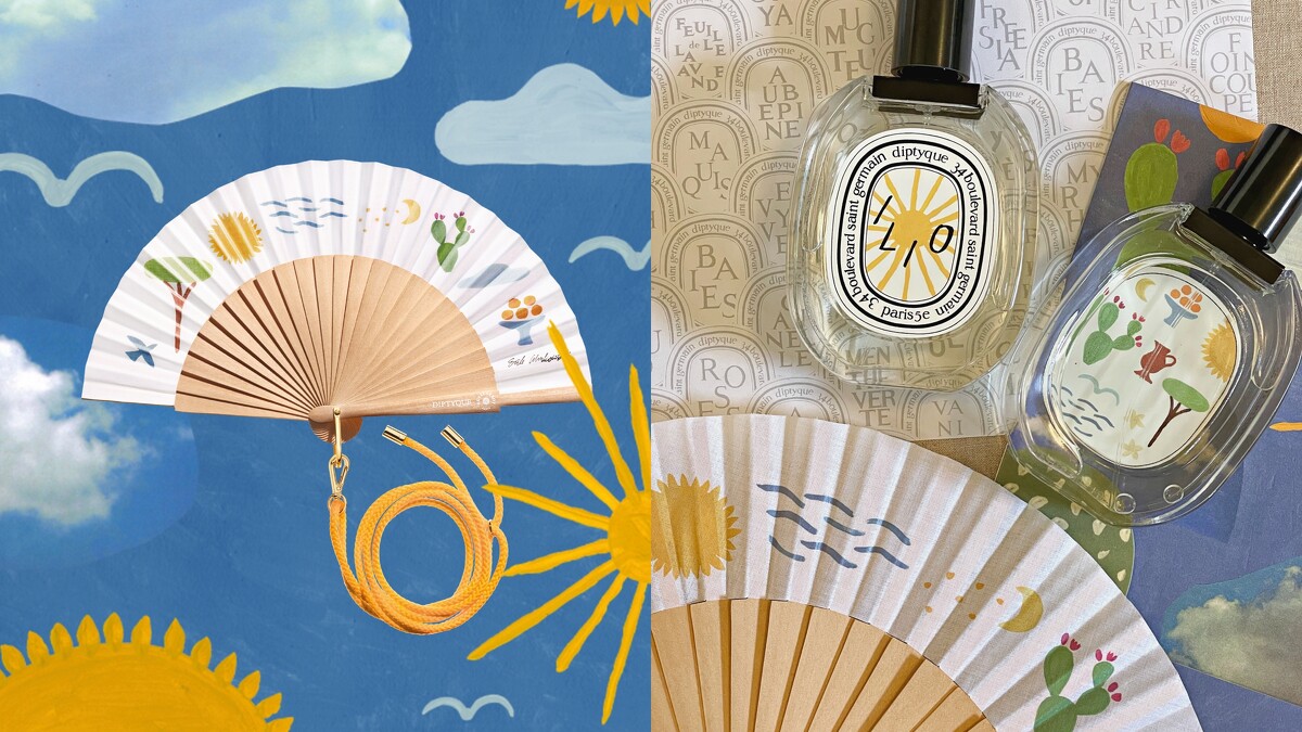 巴黎手工摺扇品牌Duvelleroy創立於1827年,這次和Diptyque合作設計推出象徵個人休閒與和諧自然的摺扇,扇面有著Erik Winkowski的創作,搭配金黃色掛繩隨身攜帶,可搭配暖陽淡香水或其他喜愛的夏日香氛使用,讓人隨時隨地沈浸於夏日的療癒香氣。