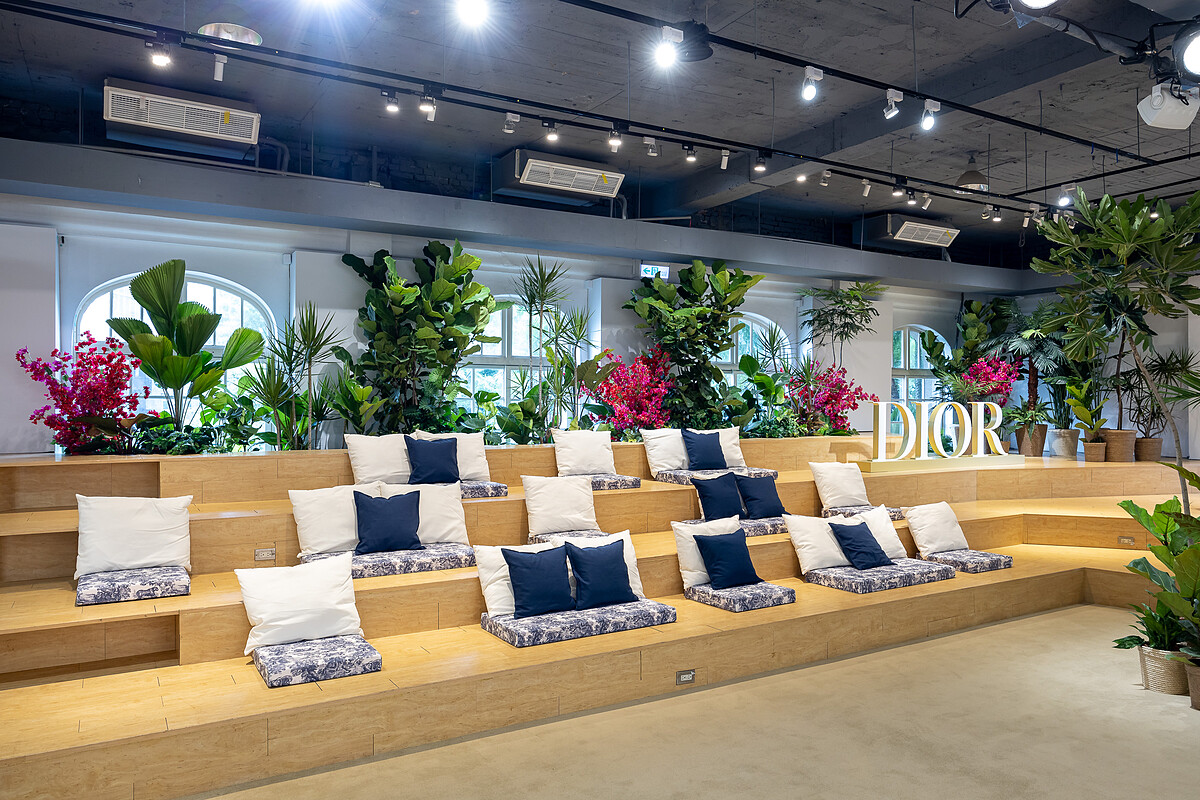 今年初夏迪奧香氛世家推出以度假為靈感的全新香氣,陽光假期香氛,也在華山文創園區中3館2樓拱廳重現南法夏日度假氛圍。展場以高訂圖騰「Toile de Jouy約依印花」營造南法的度假風情,還把彩繪著約依印花的三米高長頸鹿、老虎空運來台,加上度假風躺椅、海灘叢林等等展布,讓大家宛如抵達南法花園。