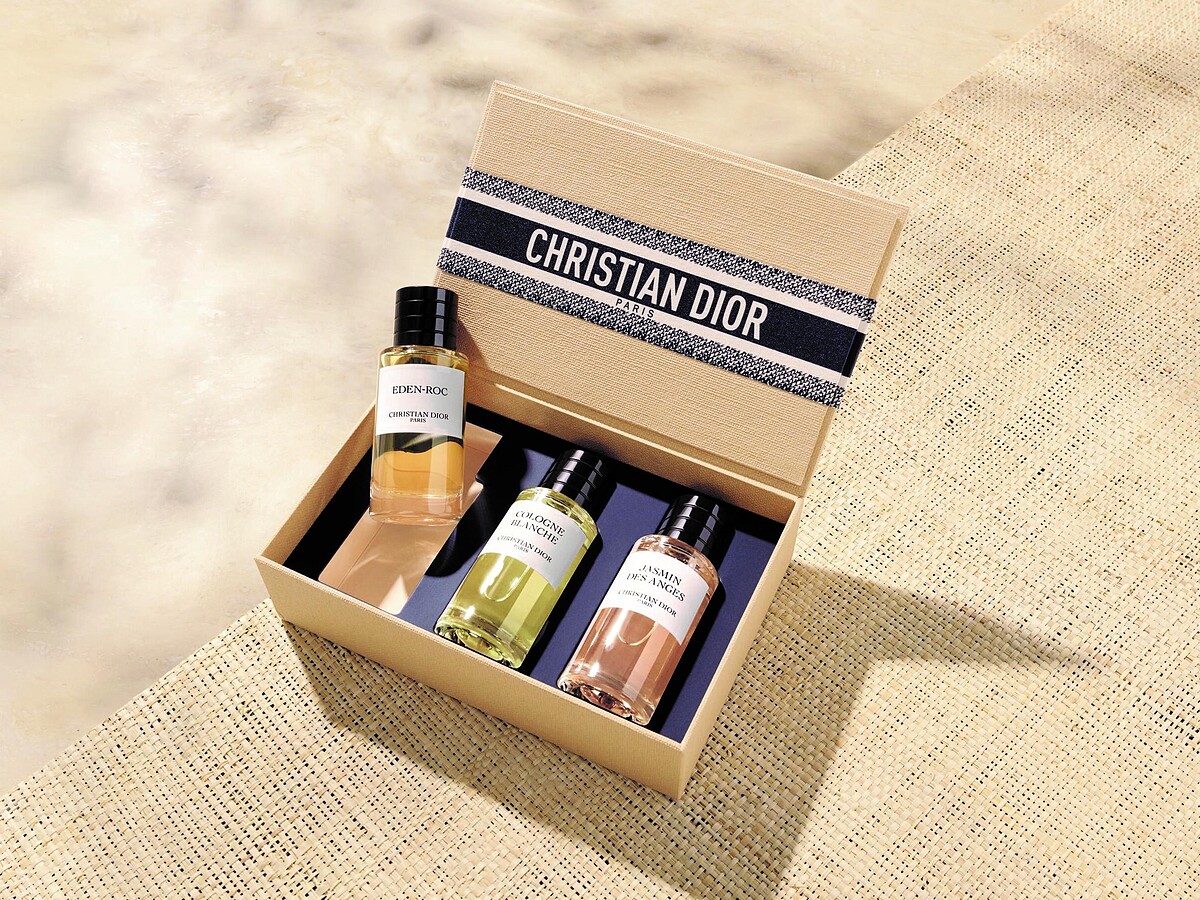 精選三款靈感來自法里維拉的度假氛圍,讓人聯想到領航員的草帽與迪奧夏季高訂布料。禮盒內含三款40ml夏季香氛:晨光古龍香氛為散發橙花與紫羅蘭香氣;伊甸岩度假香氛揉合木質與花香氣,重現蔚藍海岸迷人愉悅的度假氣息;晚夏茉莉香氛則是花香與果香調,帶有清新茉莉花香,洋溢甜蜜的杏桃香與蜂蜜糖味。