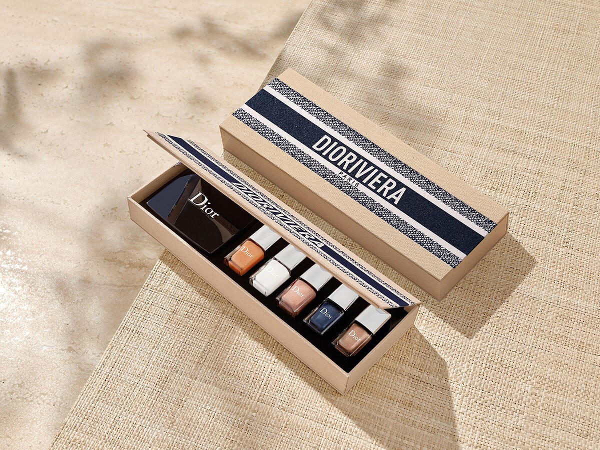組合內包含《迪奧經典五色眼影》#233 蔚藍燦夏,與5款《迪奧指甲油》,色選從寶藍、粉橘、橙色、古銅金到珍珠白,一字擺開像極一幅海濱度假畫作。