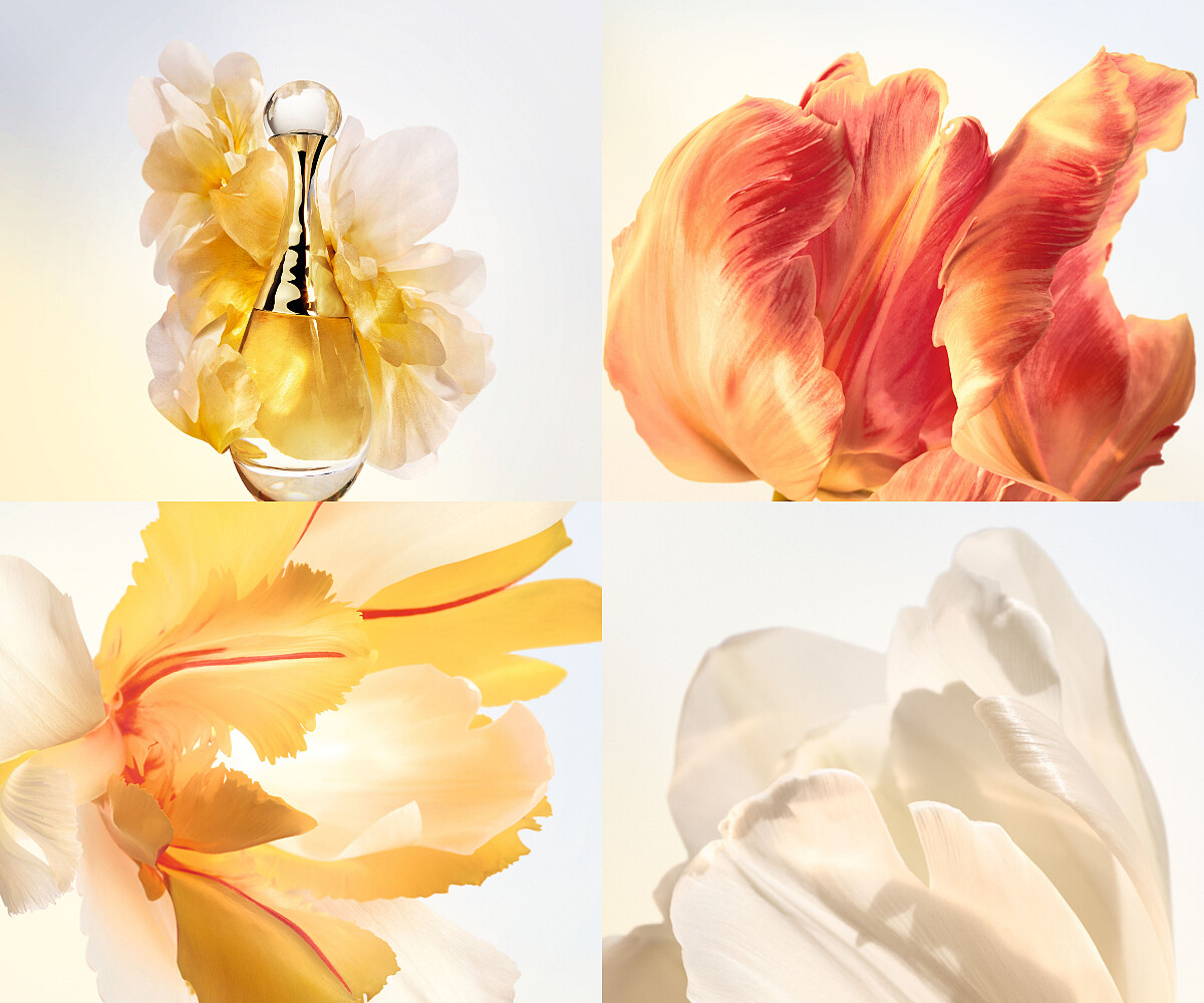 FK:容我用電影的術語回答。我追蹤對焦,放大特寫,把花朵放大在畫面中心,讓花朵膨脹擴大,撲天蓋地就只有花。以我所見,它們像是維度扭轉、平面變成了立體,像是以大調演奏的歌。花朵突然變得浮誇,輪廓分明,為香水注入前所未有的瑰麗馥郁。我想讓它改頭換面,花香如突襲般激烈。無需等候,J'adore的花束香氣會立即俘虜你。