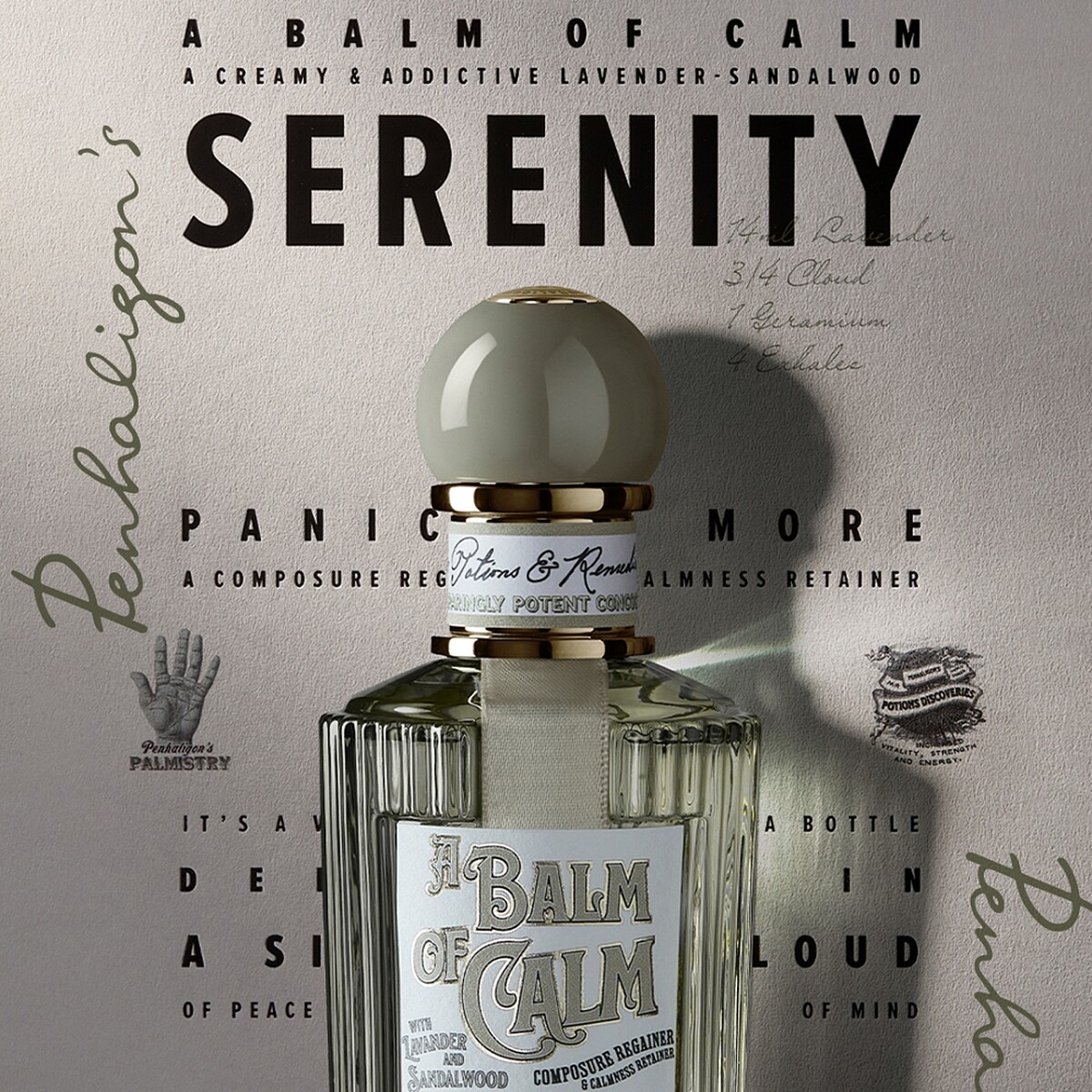 香氛配方:薰衣草,一帖即時性的寧靜配方。任憑意識漂浮在天竺葵、萊姆酒和木香交疊的雲霧之中,彷彿深吸入一劑 Penhaligon’s 的靜謐。