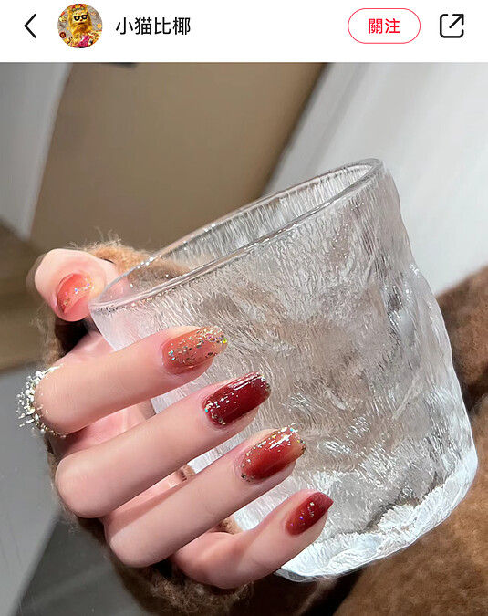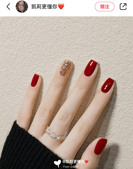 而且即使是單色,也可以透過增添透明感、暈染、做成貓眼款、點綴一些金色珠光或亮片,來讓紅色系美甲呈現出更多變化,好看又時髦。