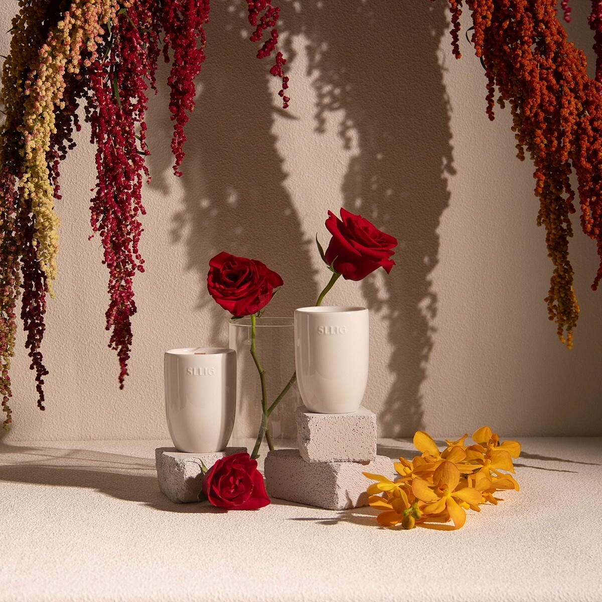 蠟燭更加入了新的陶瓷元素,從練土、旋坏、修坏、素燒、上釉到釉燒…等,每一個蠟燭杯都需要經過層層繁複的手續由人工作業完成,甚至在製作手工蠟燭的熔蠟、加入香氛、倒模、整平修整,都是純手工,這樣充满情感與質感的手工陶瓷工藝與調香師的手作調香蠟燭結合,融合了SLLIG一貫的簡約時尚。