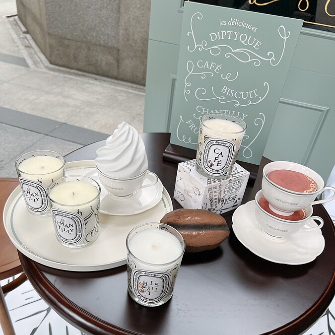 隨著限量蠟燭系列登場,Diptyque也特地打造了限時咖啡餐車。有著20年代巴黎風情的木製桌椅與咖啡館的淡綠色牆面,在香堤廣場的一隅打造出能悠閒品嘗咖啡的絕美角落。