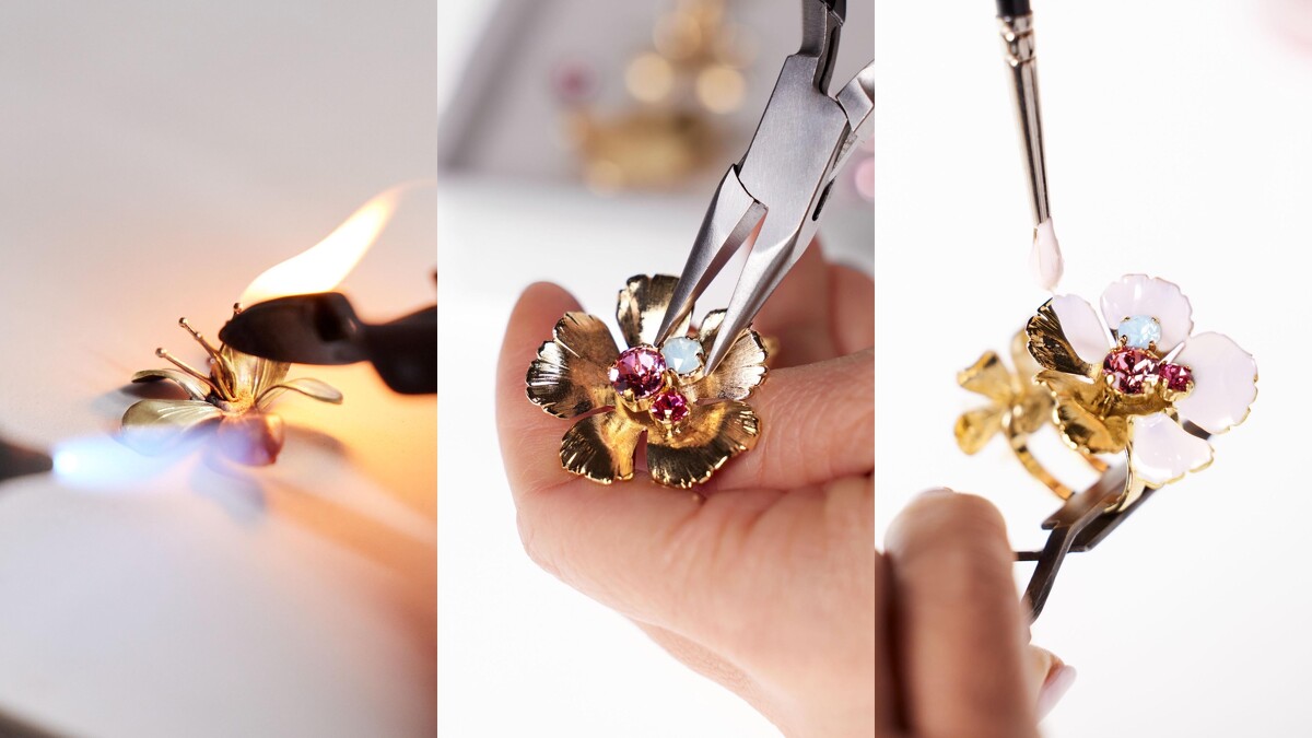 以火焰精準地雕塑出金屬花托,再以手工拋光展露其光芒,而後飾以貴重24K純金及晶亮耀眼白色、玫瑰色的水晶,最後塗上最美麗的瓷釉。珍珠霓光倒映的珍貴櫻花栩栩如生躍然眼前,裝飾於「嬌蘭 花冠粉櫻淡香水 珠櫻流蘇蜂印瓶」,讓香水成了珠寶,而珠寶成了展示舞台,Philippe Ferrandis 創作的戒指不只是蜂印瓶的裝飾,也是可配戴的首飾。滿是細節的「嬌蘭 花冠粉櫻淡香水 珠櫻流蘇蜂印瓶」,完美呈現致花見時刻繁花盛開的頌詩。