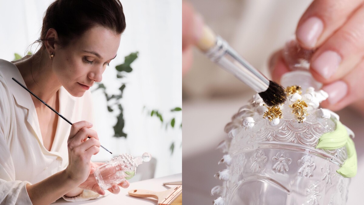 為了搭配高雅珍稀的「幸福永駐鈴蘭淡香水」,嬌蘭與藝術才華優異雕塑家Anne Lopez合作,以大理石粉末手作精雕而成,並綴著細緻22K金和優雅綠葉,珍貴的24朵飽滿鐘形花串沿著瓶身曲線將經典蜂印瓶裝飾得優雅高貴,「琉金綻舞蜂印瓶」上鮮活的花朵綻放姿態也將鈴蘭香水細緻的香氣具象呈現!