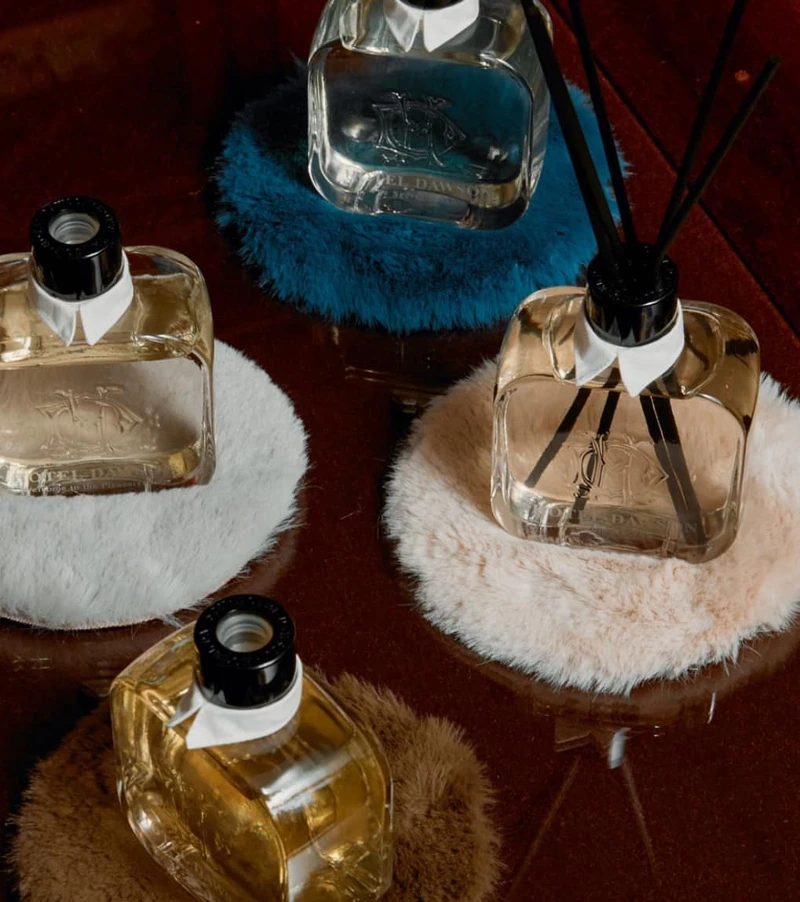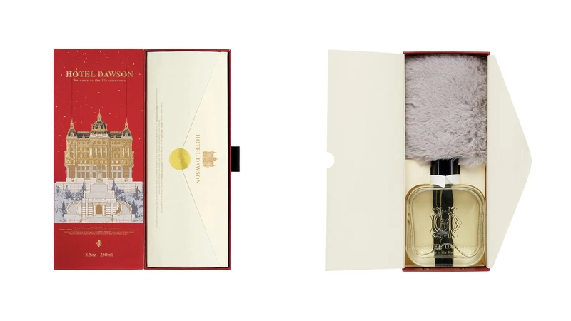每一款 Hotel Dawson 室內擴香,均附有絨毛圓墊,以及五支擴香棒,復古外盒包裝皆代表一段與香氣有關的故事,瓶身上的小領片設計,則象徵以飯店概念為核心的品牌精神。讓大家在使用同時也彷彿入住 Hotel Dawson 客房。