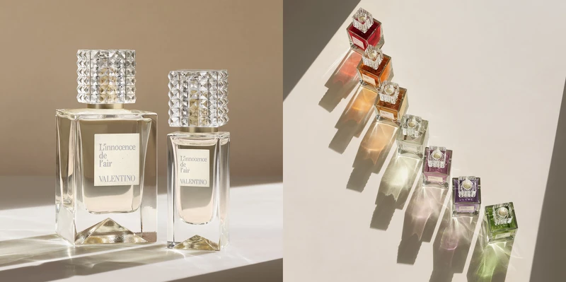 VALENTINO的優雅又大氣的設計美學,也極致發揮在這次的高級訂製香水系列上。香水瓶身採用全透明玻璃設計,完美映射出每款香水的色彩變化。更在瓶蓋和瓶底採用透明鉚釘的設計,將VALENTINO的品牌靈魂注入每一瓶香水中。此外,每支香水的瓶身都搭配高訂禮盒專用布料製成的布標,賦予它們獨一無二的身份象徵。