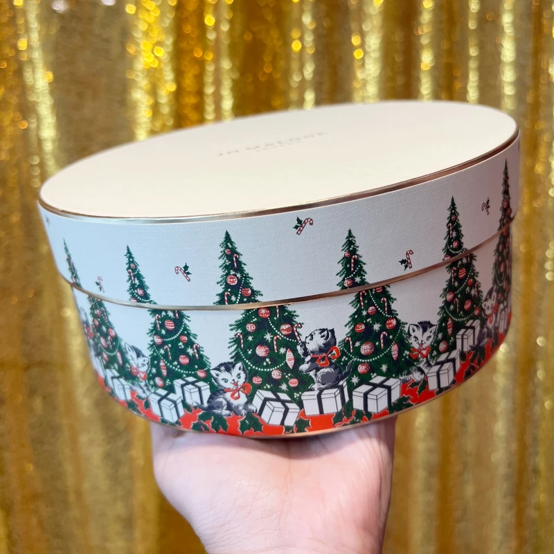 圓形禮物盒側面還有聖誕樹與貓咪圖案。