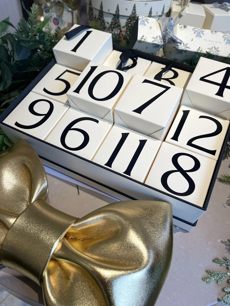 Jo Malone London 第二波聖誕推出首款12天倒數日曆,同樣以經典奶油白色為搭配黑色緞帶的低調優雅包裝,包含 4 款隨心切換的精選香水 9ml、3 款滋潤護手霜15ml、2 款香氛潔膚露 30ml,還有3 款迷你旅行工藝蠟燭,這款還是大稻埕形象概念店/官網旗艦店獨家販售唷!