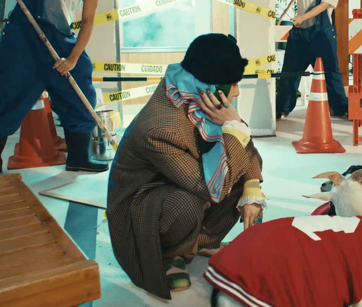 帽子底下的薄荷綠和紅色相間的絲巾,美甲的顏色也完美呼應!另一邊則是以黑白為主的圖樣。
