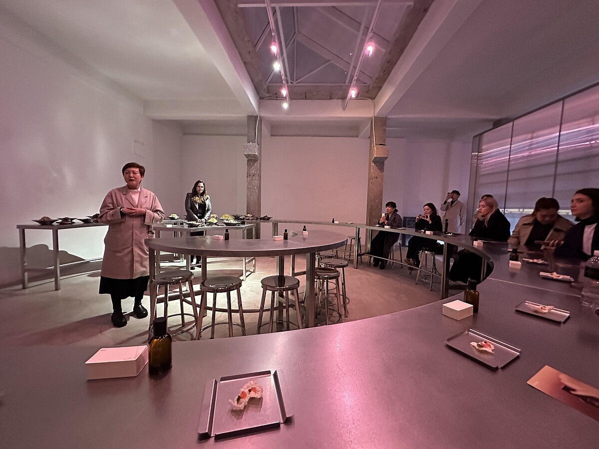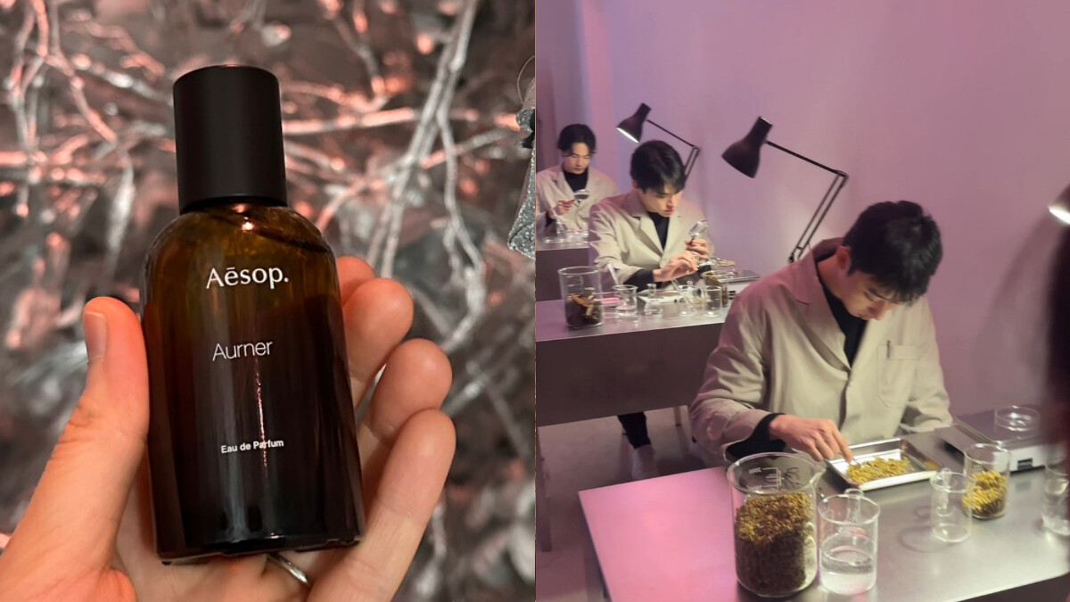 隔日我們來到了Aesop詠香水的發表會現場,是位於巷弄間的展廳,門口的鼻子雕像與金屬牆面形成強烈對比,推開門映入眼簾的是一整排詠香水的核心成分—白木蘭花植栽,典雅純淨非常舒適,而當我們再進入另一個空間時,則是有著截然不同的感受:就像是在粉紅色的暗房內佈滿了張力十足的金屬感枝葉和花朵,期待已久的詠香水Aurner就陳列在其中,就在此時,還沒來得及試香的我們又被帶入另一個空間,裡面有3位職人,模擬調香師在調製的過程,同時也看到詠香水運用到的許多珍稀成分,最後,我們終於進入了發表會現場,調香師賽琳.巴雷爾Céline Barel早已準備好並熱烈地歡迎著我們。