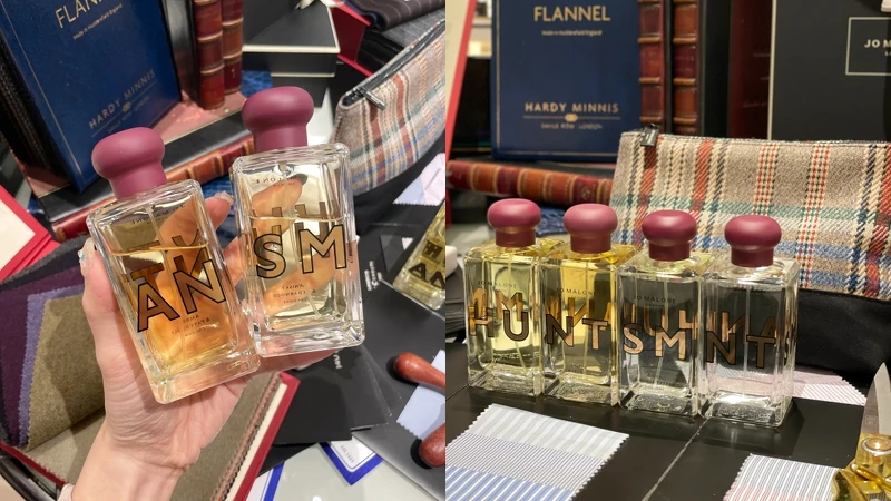 一共有四款限量香氣, 就是以高定西服為靈感打造,瓶身上有著 Huntsman 燙金字樣搭配質感酒紅瓶蓋,從清晨的清新茶香到月夜的迷人酒香,適合各種場合。