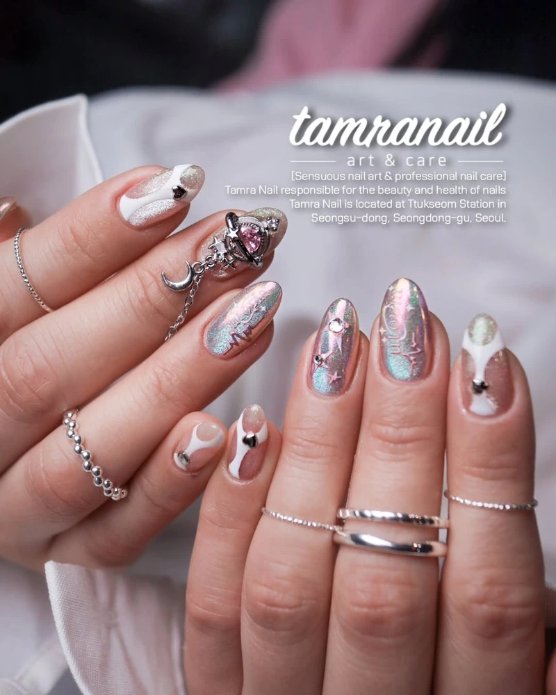 雖然説鏡面美甲容易讓人聯想到高冷感,不過其實白色系近年來也很受歡迎。以乳白色打底,再曡上珍珠粉,低調又溫柔,極具仙氣感。